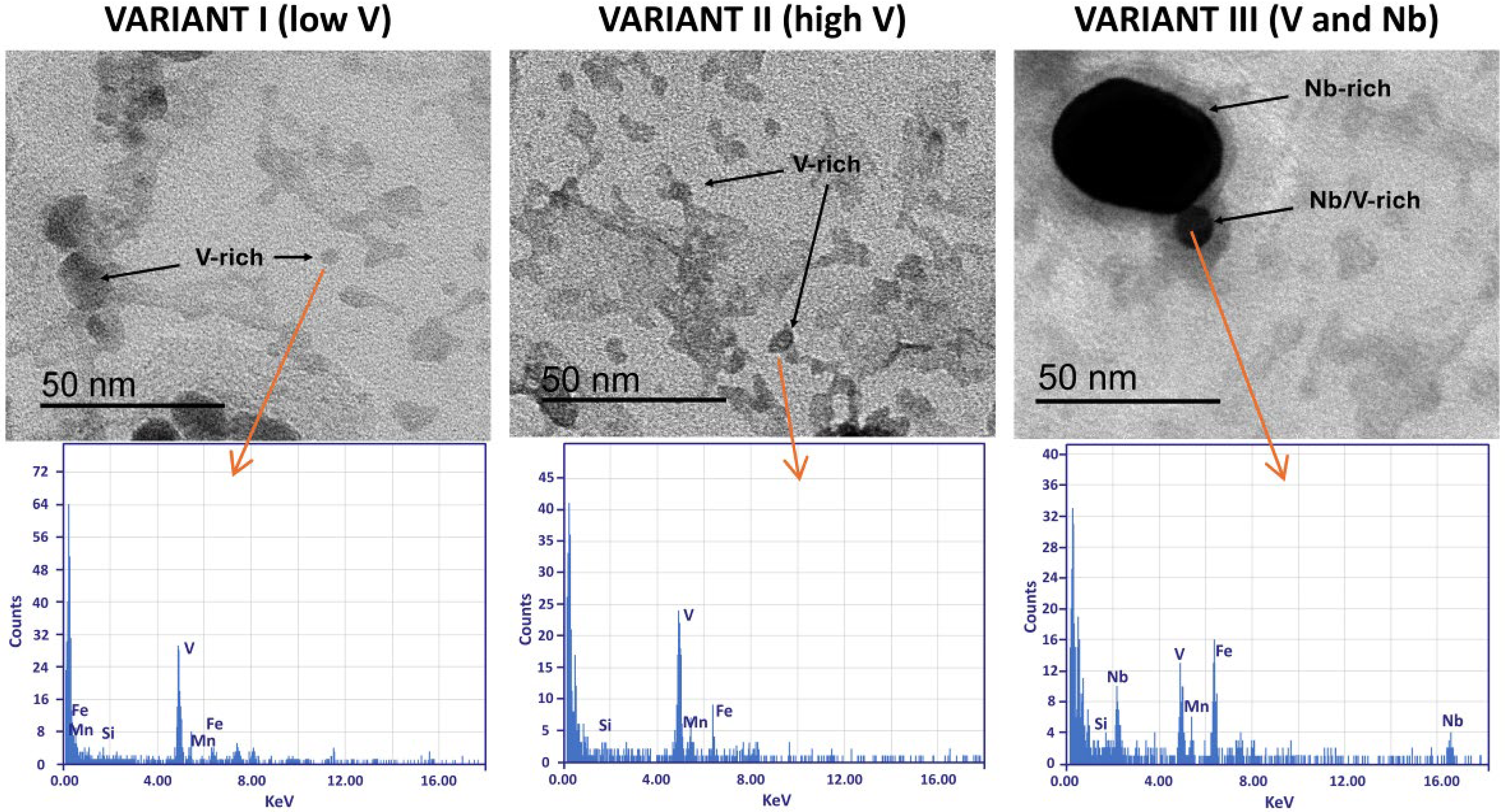 Variant III (V and Nb) | 33.5 ± 0.2 | 46.2 ± 0.2 | 18.7 ± 0.2 | 0.2 ± 0.1 | 1.4 ± 0.1 |