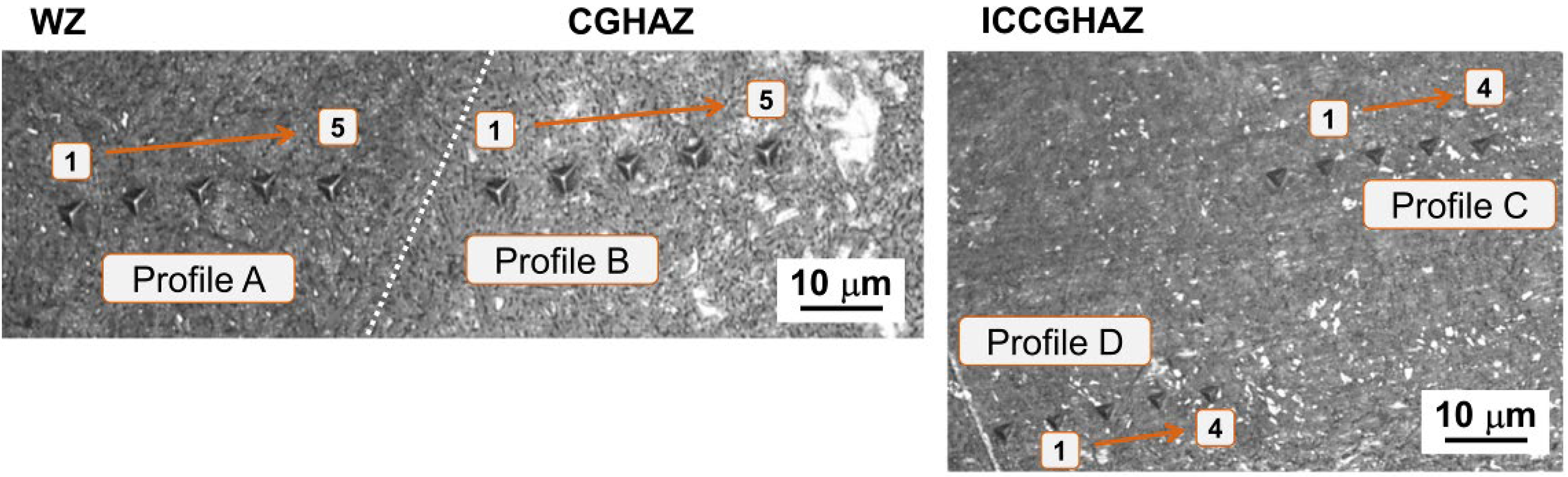 Profile B (CGHAZ) | 1.20 ± 0.02 | 166.3 ± 24.3 | 2.1 ± 0.1 | 38.1 ± 1.4 | 4.9 ± 0.2 | 1.04 ± 0.03 |