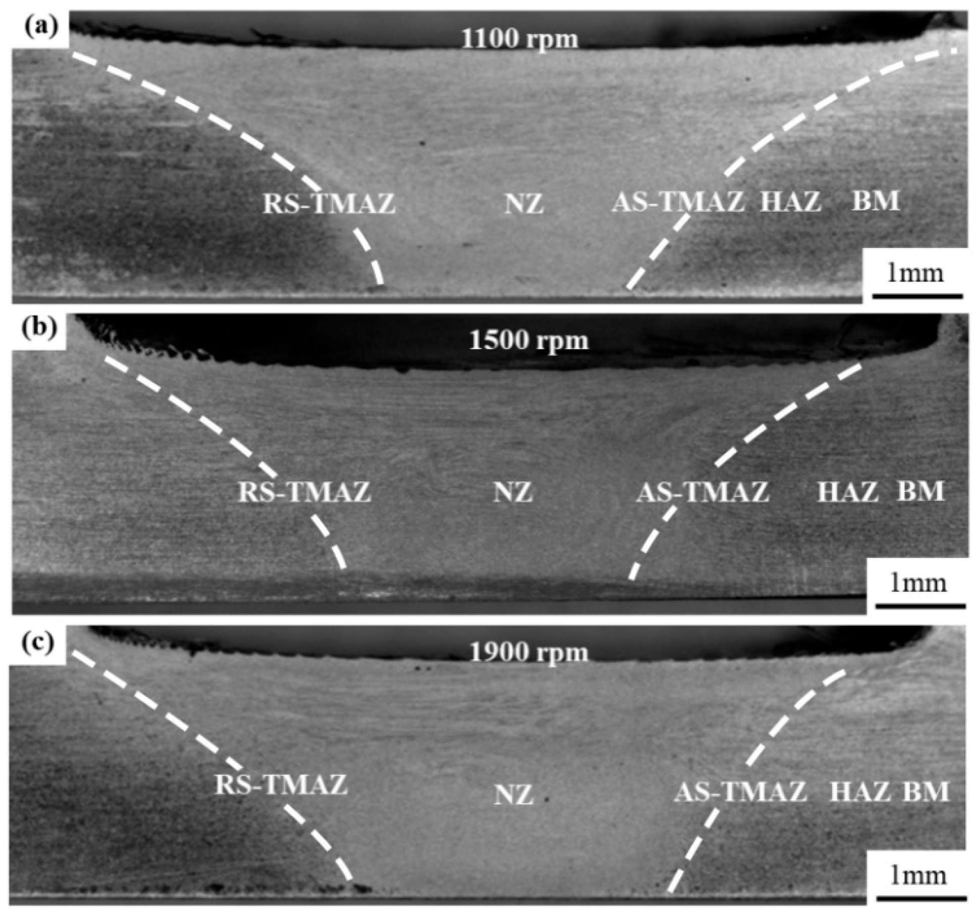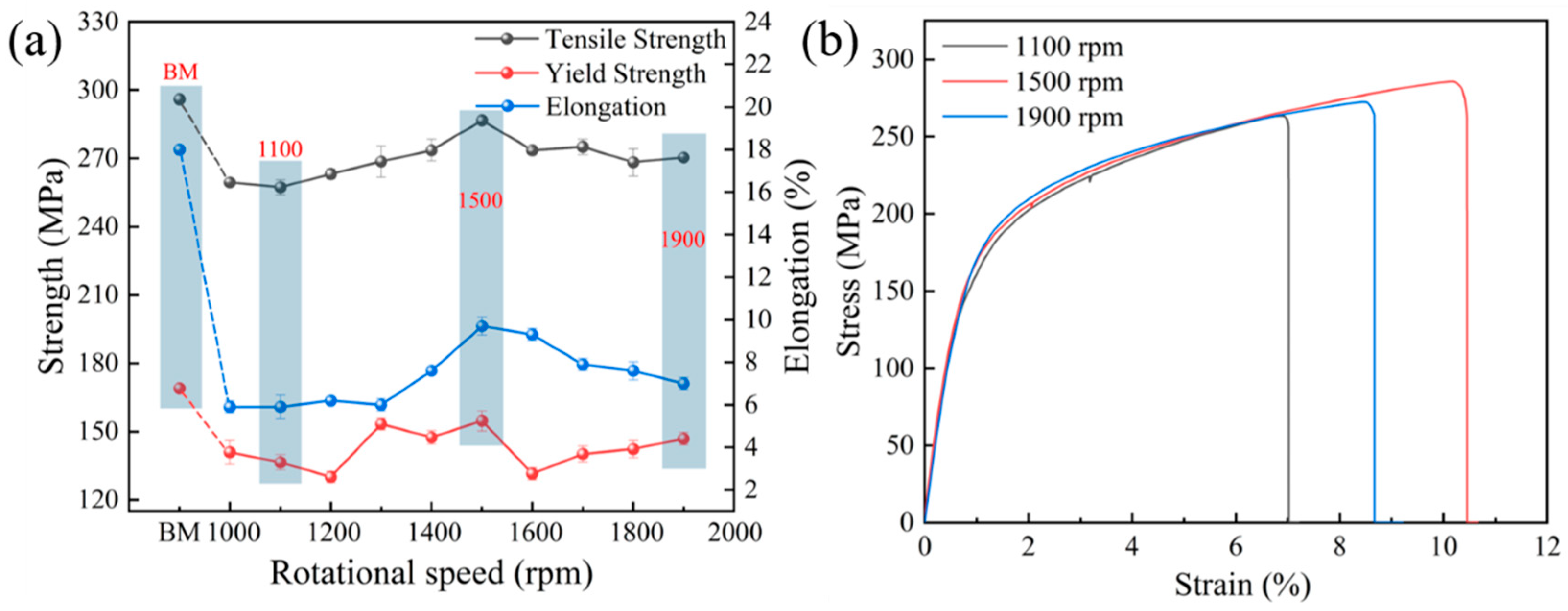 4.1. Effect of Rotational Speed on the Microstructure and Mechanical Properties of FSW Joints