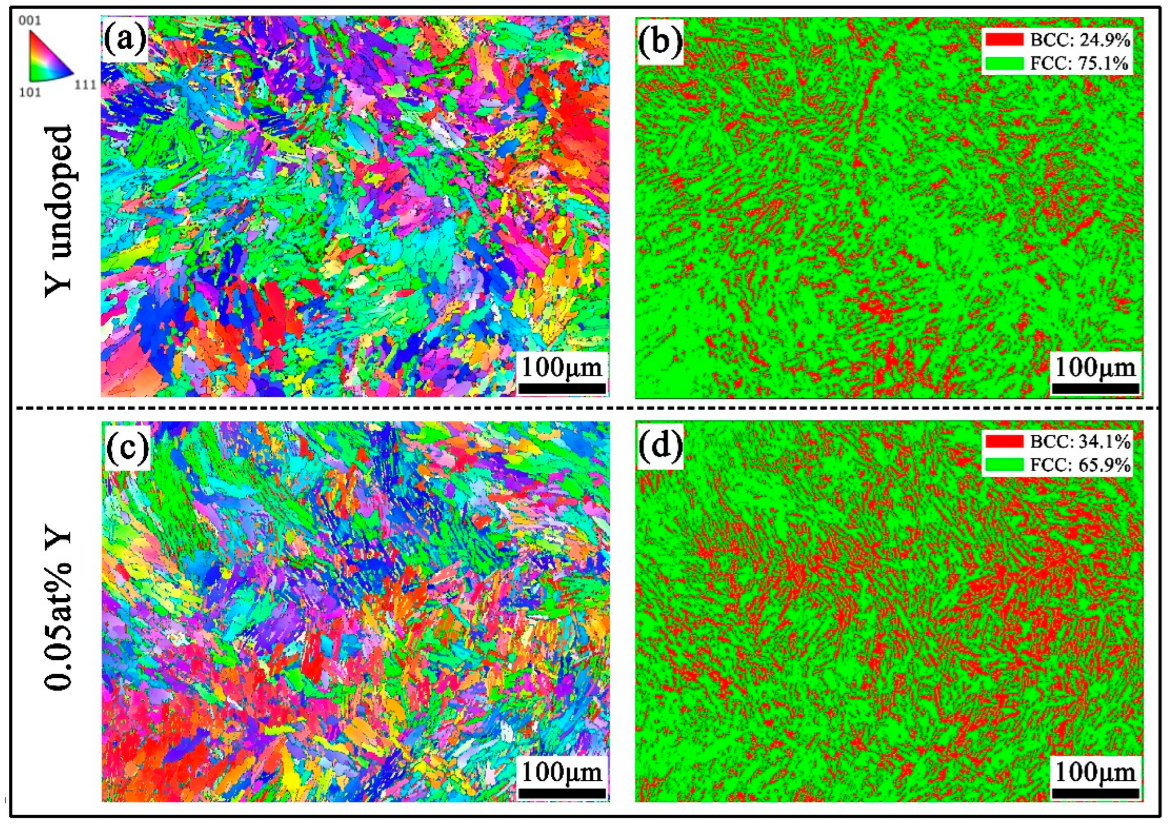 - Zhou, H.; Mao, J.; Jiang, H.; Zhang, H.; Wei, W.; Qin, S.; Tingjun, L.; Xu, J. Effect of rare-earth element Y addition on microstructure and mechanical properties of CrFeNi2 medium entropy alloy. Intermetallics 2023, 163, 108079. [Google Scholar] [CrossRef]