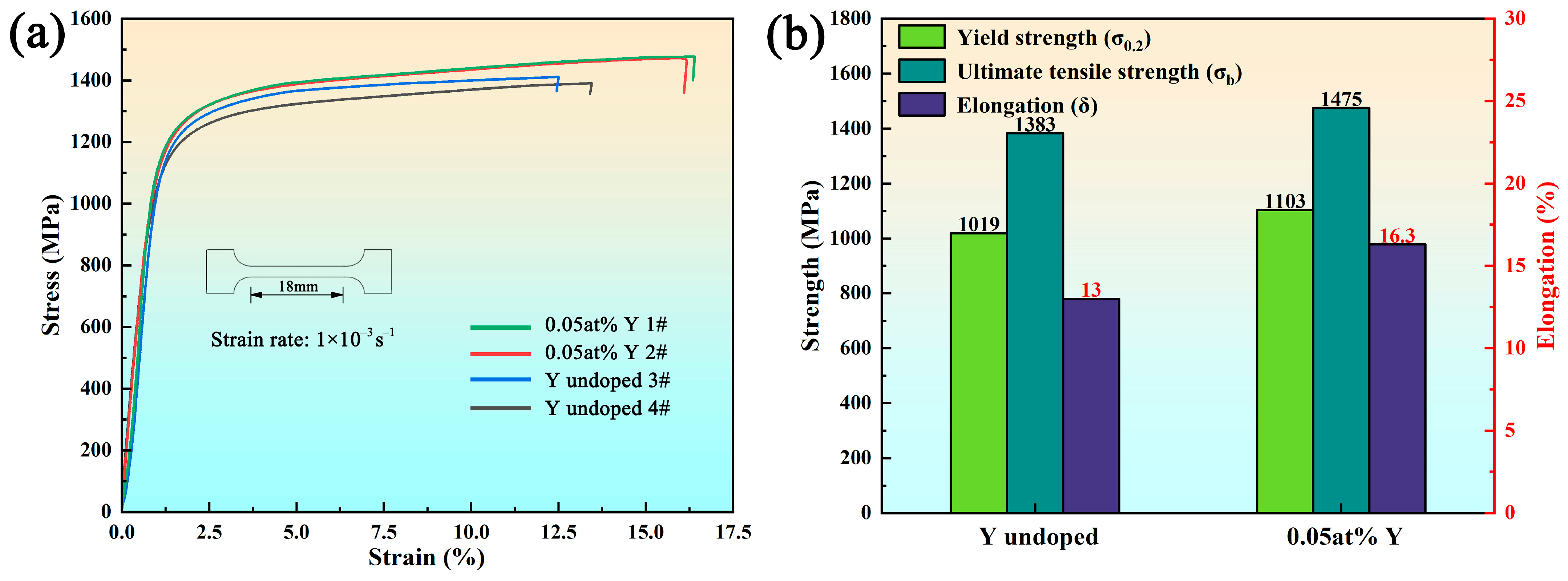 - Tensile tests demonstrate a simultaneous enhancement in mechanical performance, with yield strength increasing from 1019 MPa to 1103 MPa, ultimate tensile strength from 1383 MPa to 1475 MPa, and elongation from 13.0% to 16.3%. These improvements are attributed to multiple strengthening mechanisms including dislocation hardening, grain boundary strengthening, and second-phase strengthening.