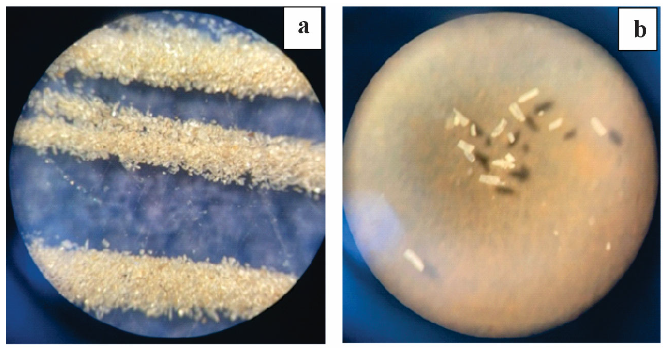 Tailings concentrate under binocular microscope: (a) non-electromagnetic fraction (×25); (b) spodumene in concentrate (×40).