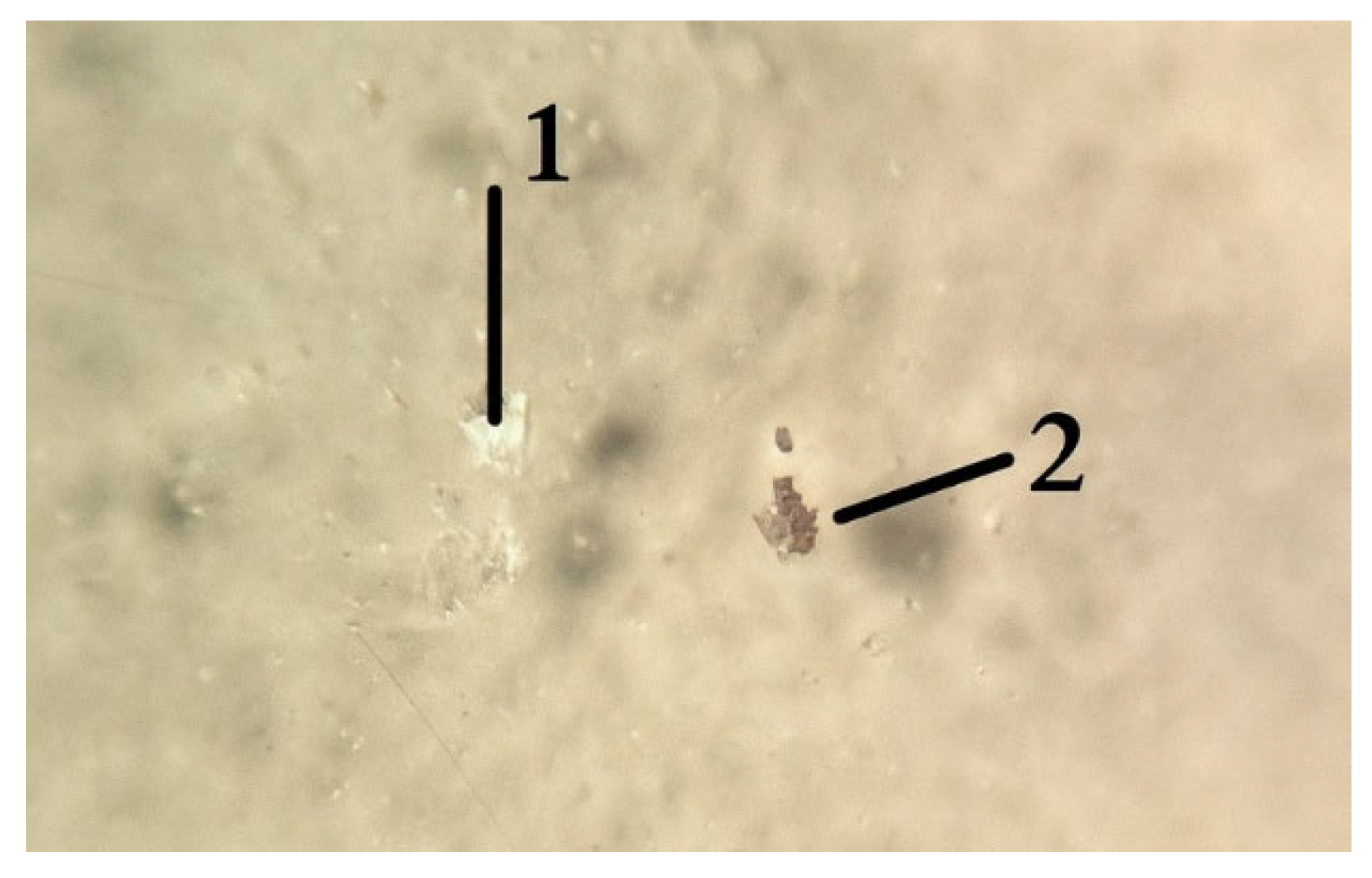 Muscovite (1) and biotite (2) in tailings sample under binocular microscope.