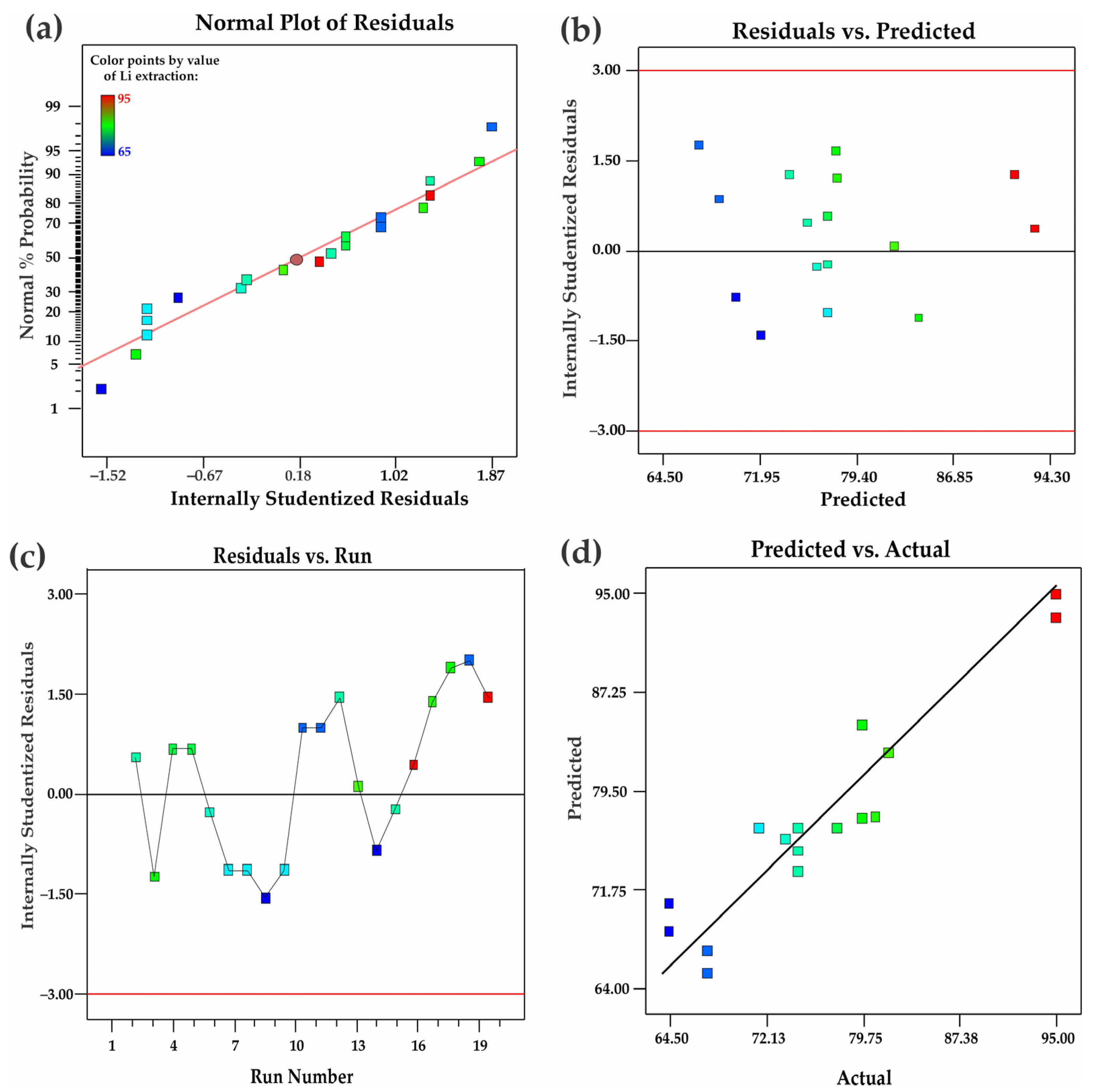 Figure 7) were used to comprehensively assess the adequacy of the constructed quadratic model describing lithium recovery. The normal probability plot of residuals (