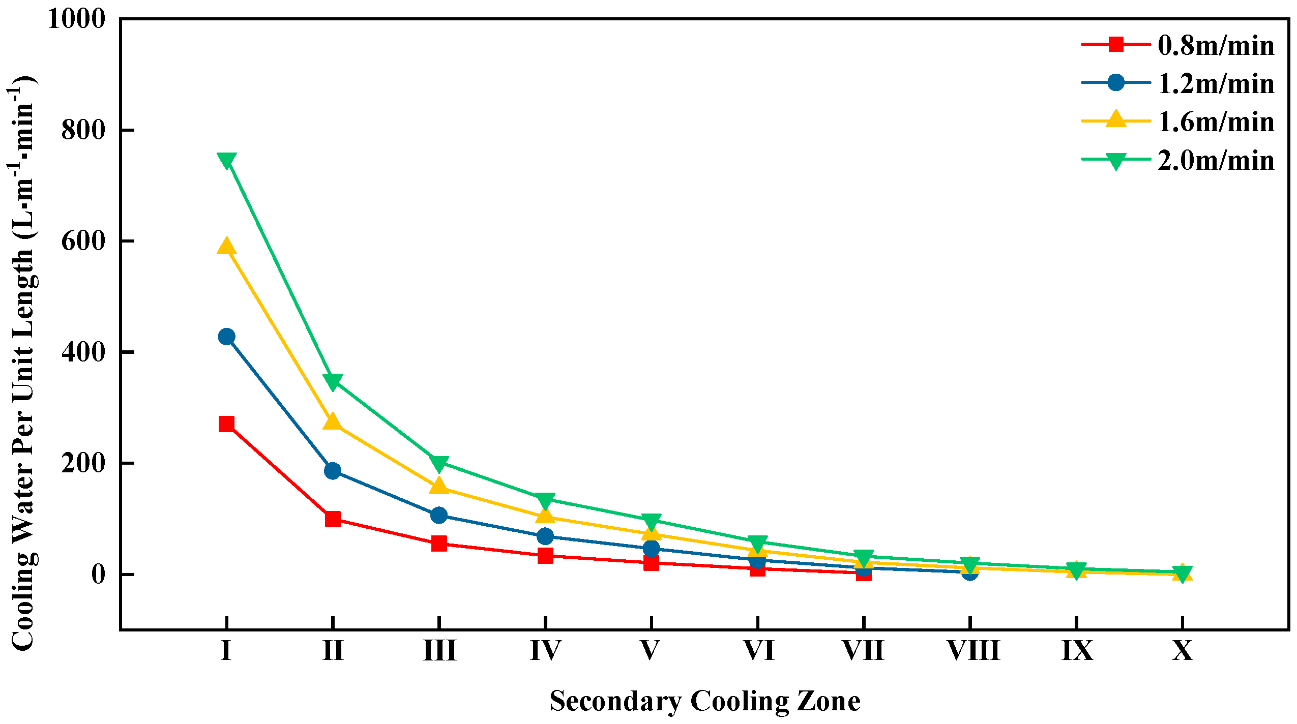 Figure 3, it can be seen that for all four casting speeds, the inner-arc water flow per unit length in the secondary cooling zones gradually decreases along the casting direction.