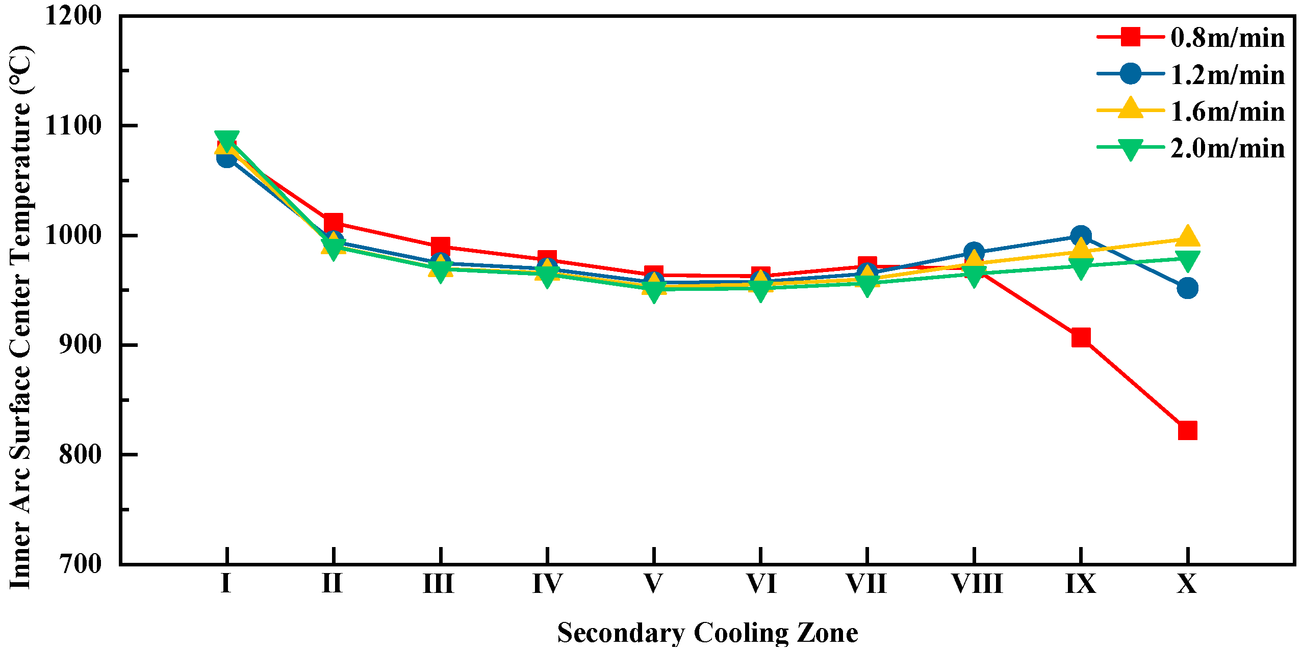 The variation curves of the average inner-arc surface center temperatures along the casting direction for each secondary cooling zone at different casting speeds are shown in