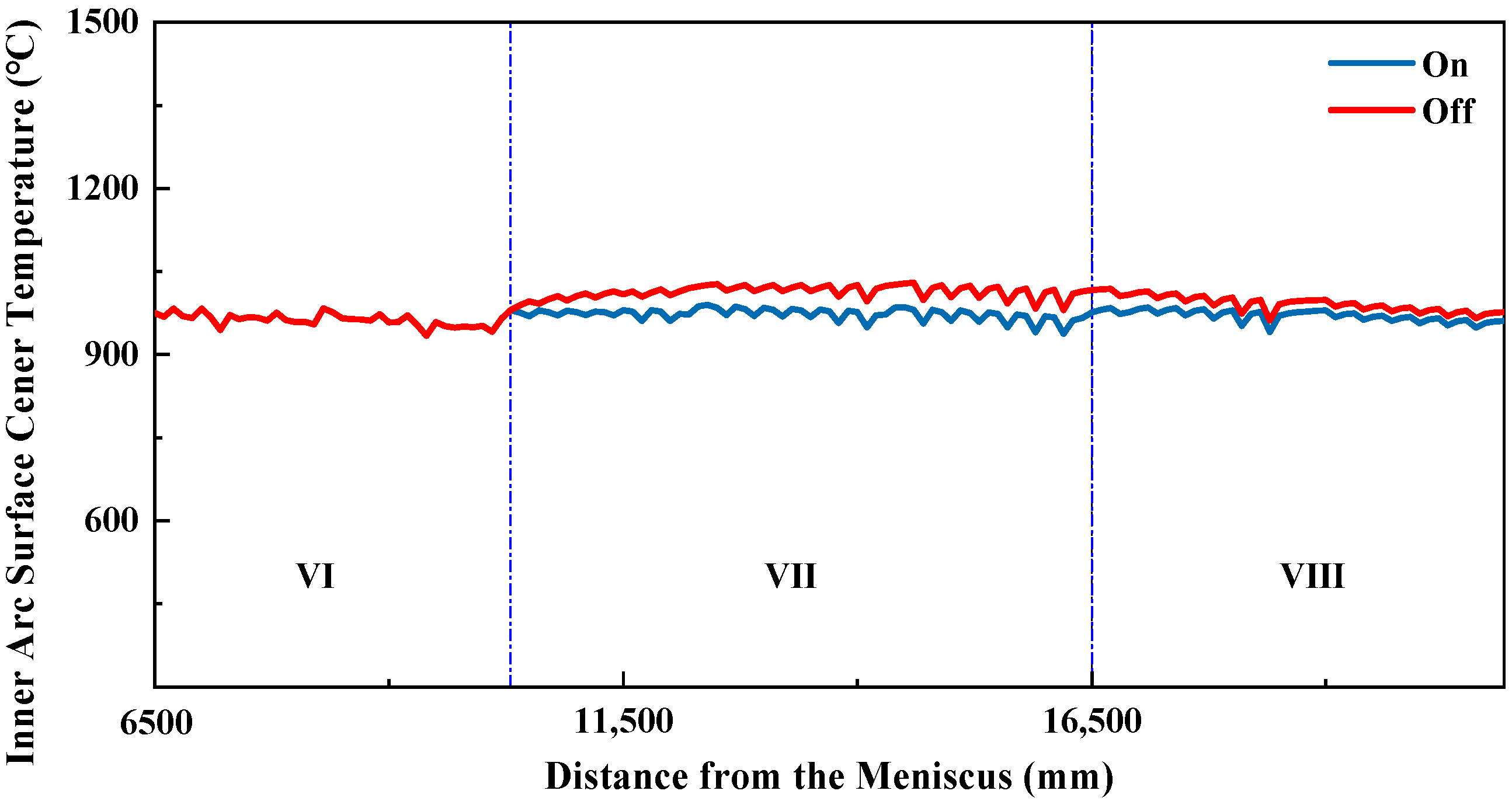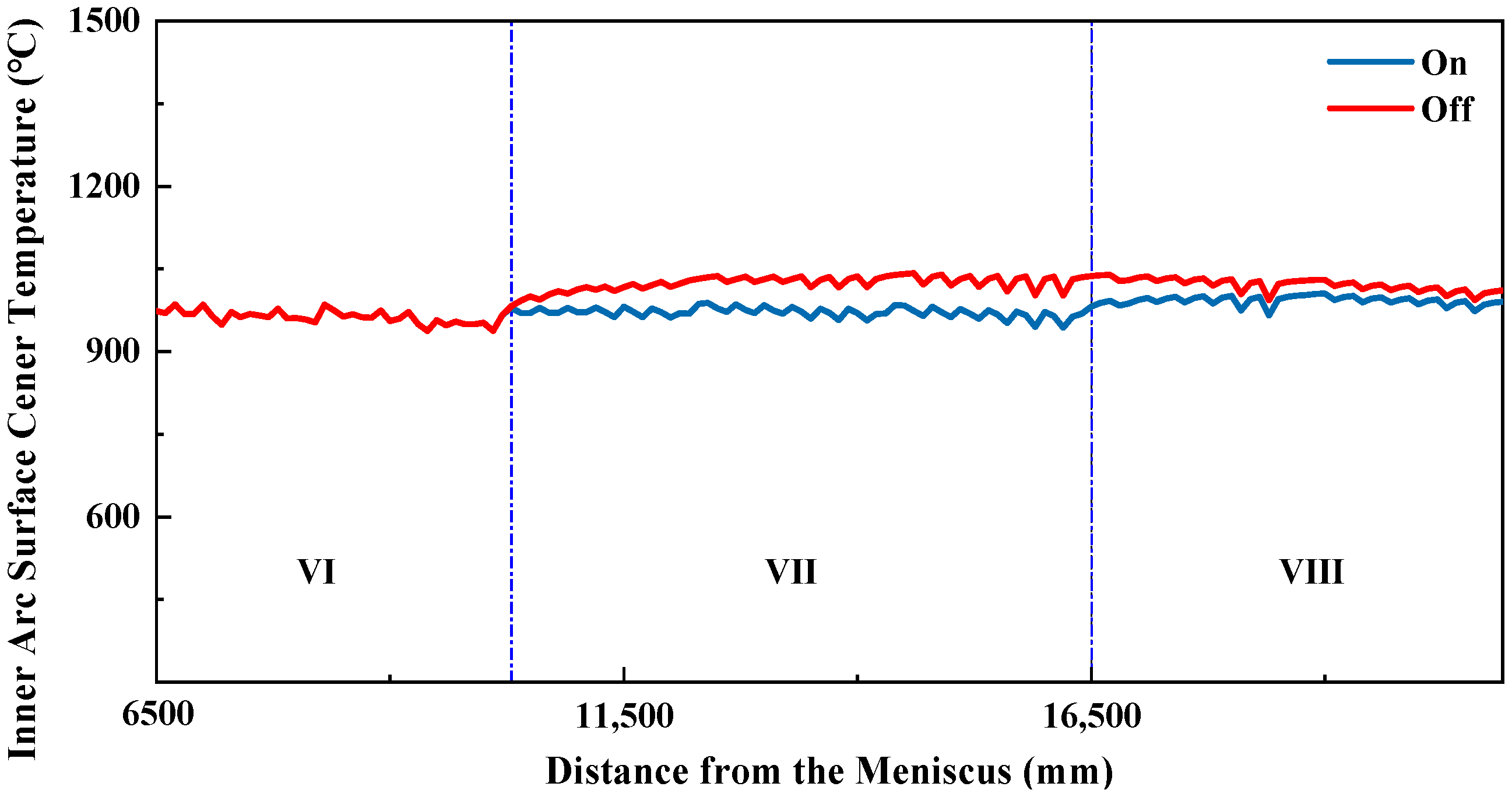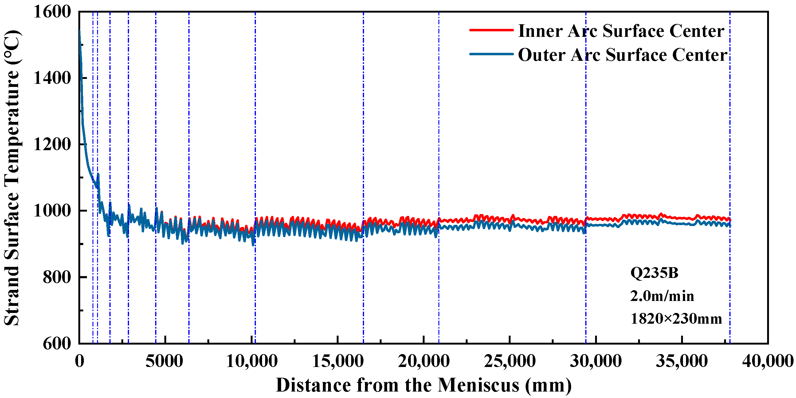 From the above two figures, it can be observed that the cooling rates in each zone conform to the design principles of secondary cooling. In the initial stage of secondary cooling, the inner-arc surface center temperature of the slab drops rapidly, preventing shell breakage. Subsequently, the slab surface temperature decreases more slowly as the shell gradually thickens. In secondary cooling zones 6 to 8, a slight temperature rebound is observed, which helps ensure that the slab surface temperature at the straightening point avoids the low-ductility range.