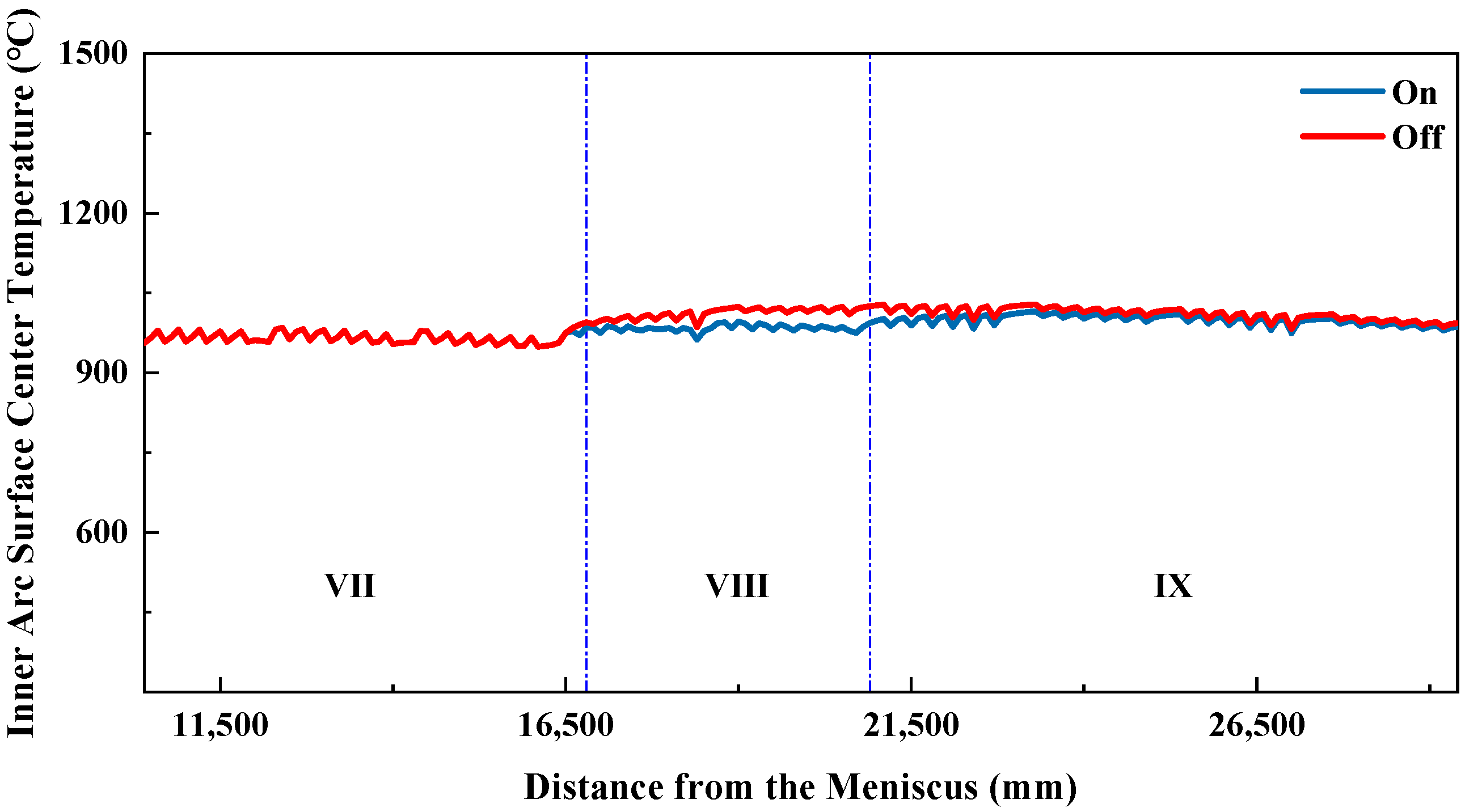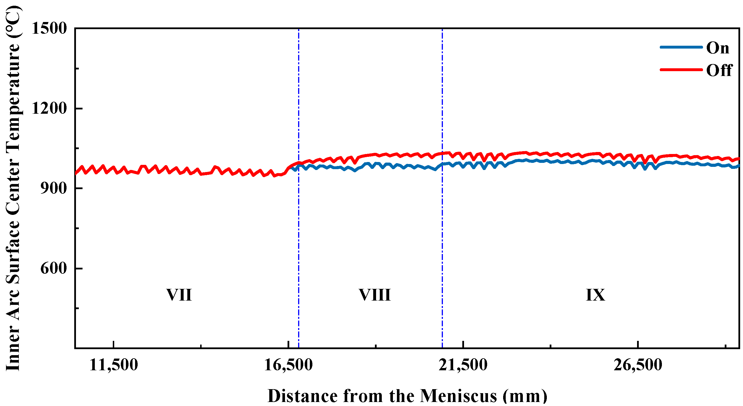 Table 8. Since differences in inner- and outer-arc water flow begin in secondary cooling zone 5, only the average surface temperatures and temperature differences for zone 5 and the subsequent secondary cooling zones are presented.