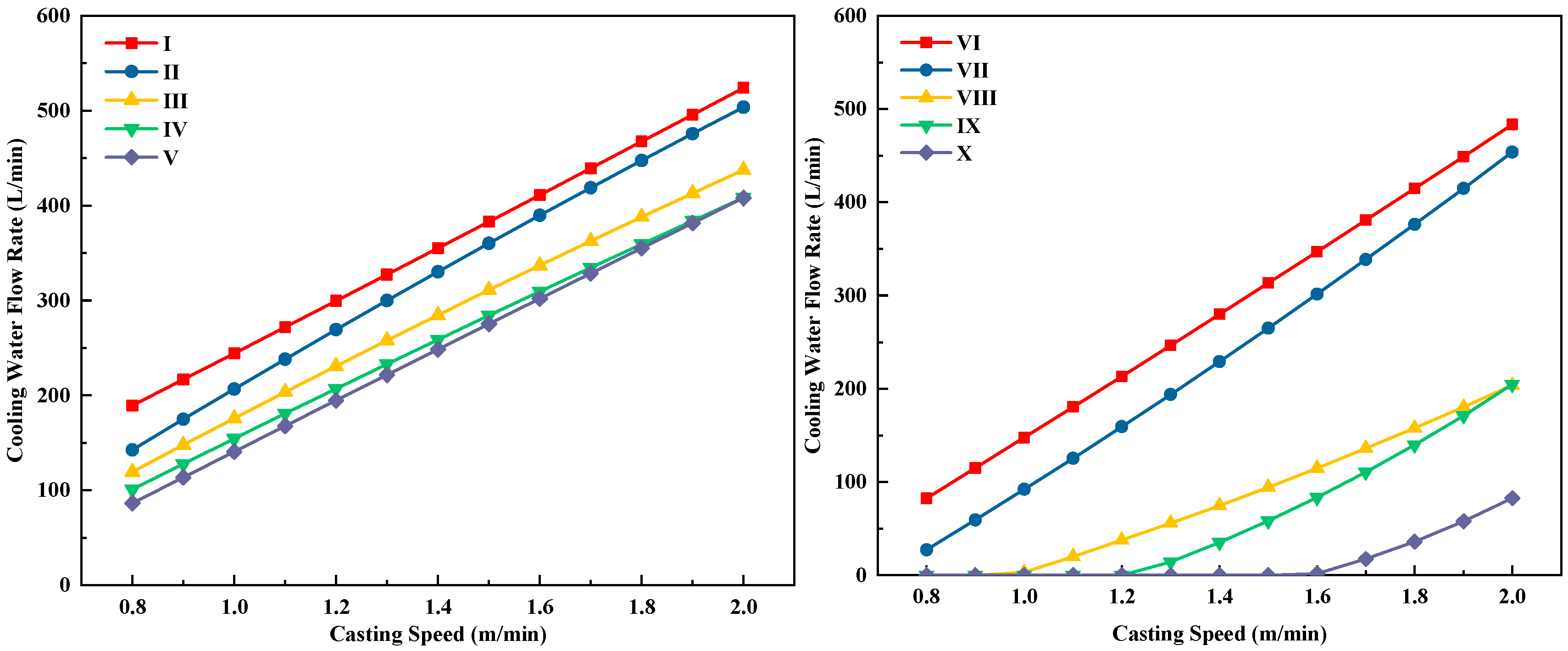 After extensive simulation calculations, the variation in water flow with casting speed for each secondary cooling zone was determined. The curves of water flow versus casting speed for zones 1 to 10 are shown in