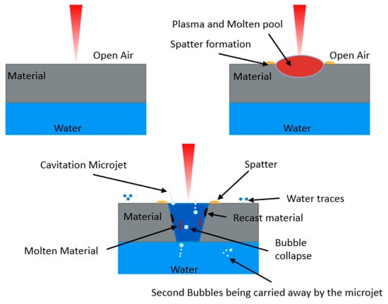As illustrated in Figure 1, the initial drilling position resembles an open-air state. As drilling progresses, the laser penetrates the material, eventually creating an initial through-hole (pilot hole). As shown in Figure 1, under backwater-assisted conditions, the liquid medium penetrates into the through-hole via capillary action, positively influencing subsequent processing. Particularly under thinner water layer conditions, cavitation bubbles induced by the laser interact with the liquid–solid interface during their expansion and collapse, exhibiting asymmetric collapse behavior. This asymmetric collapse generates microjets directed toward the material surface, resulting in highly directional fluid impact effects [,].
