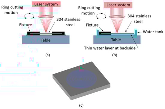 Schematic diagram of laser processing in (a) Open air conditions and (b) Backside water assisted conditions (c) ring cutting path.