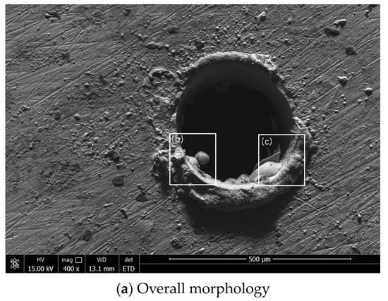 Under non-water (air) conditions, the same high energy input combined with multiple processing cycles results in the formation of a pronounced heat-affected zone (HAZ) around the hole periphery and wall, with a large amount of molten metal resolidifying into a thick recast layer, as shown in Figure 15c. Since the slag at the hole edge and bottom cannot be effectively flushed or rapidly removed by fluid action, deposition and surface roughness are increased, as illustrated in Figure 15b. In a gaseous environment, bubble generation and impact are minimal, and the non-uniform temperature field provides insufficient convection to remove slag effectively. Consequently, the overall hole profile deteriorates, and the HAZ becomes more significant.