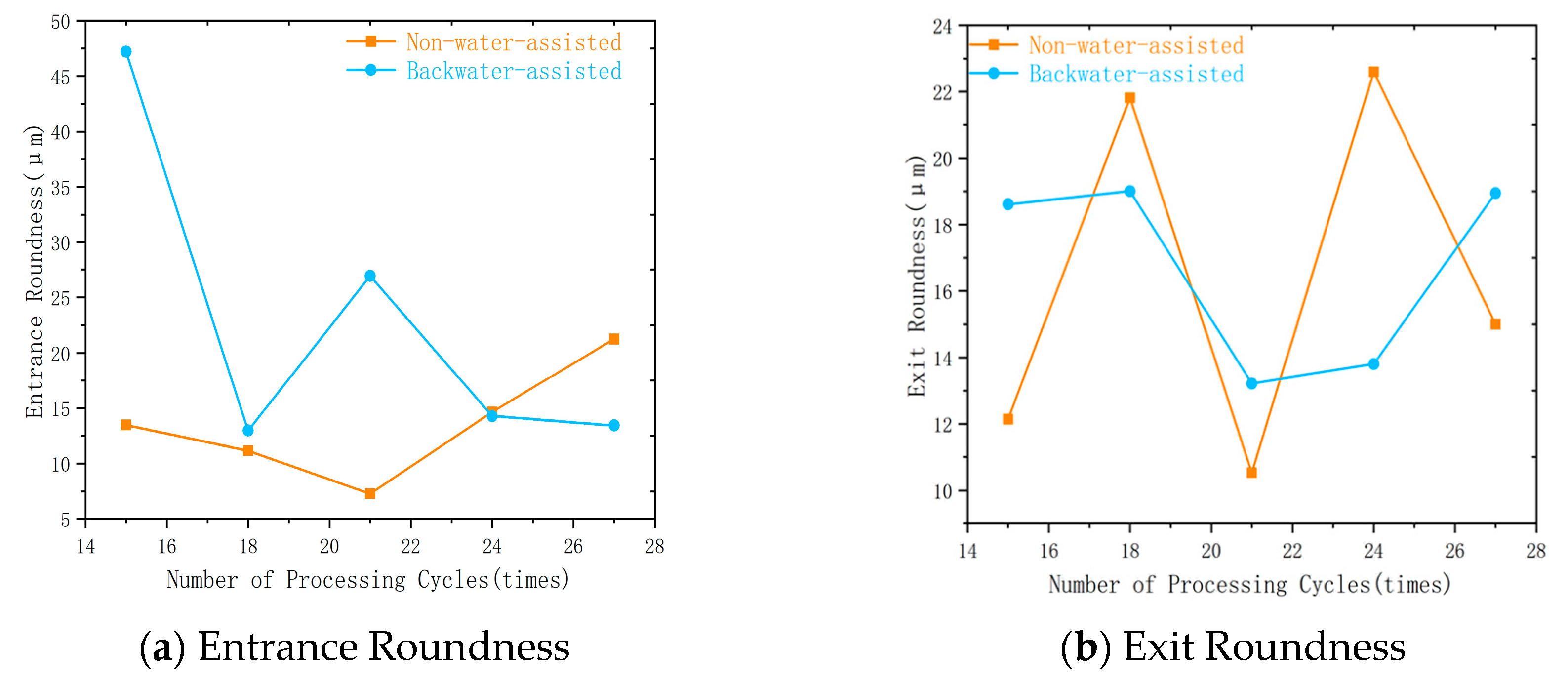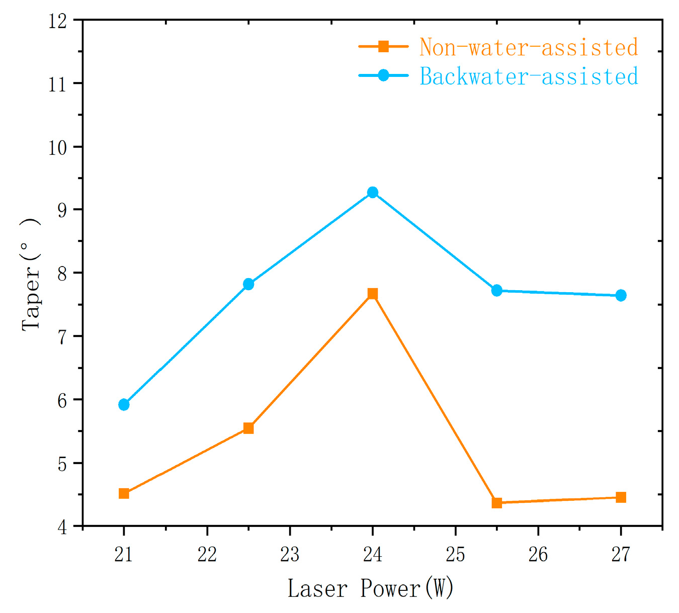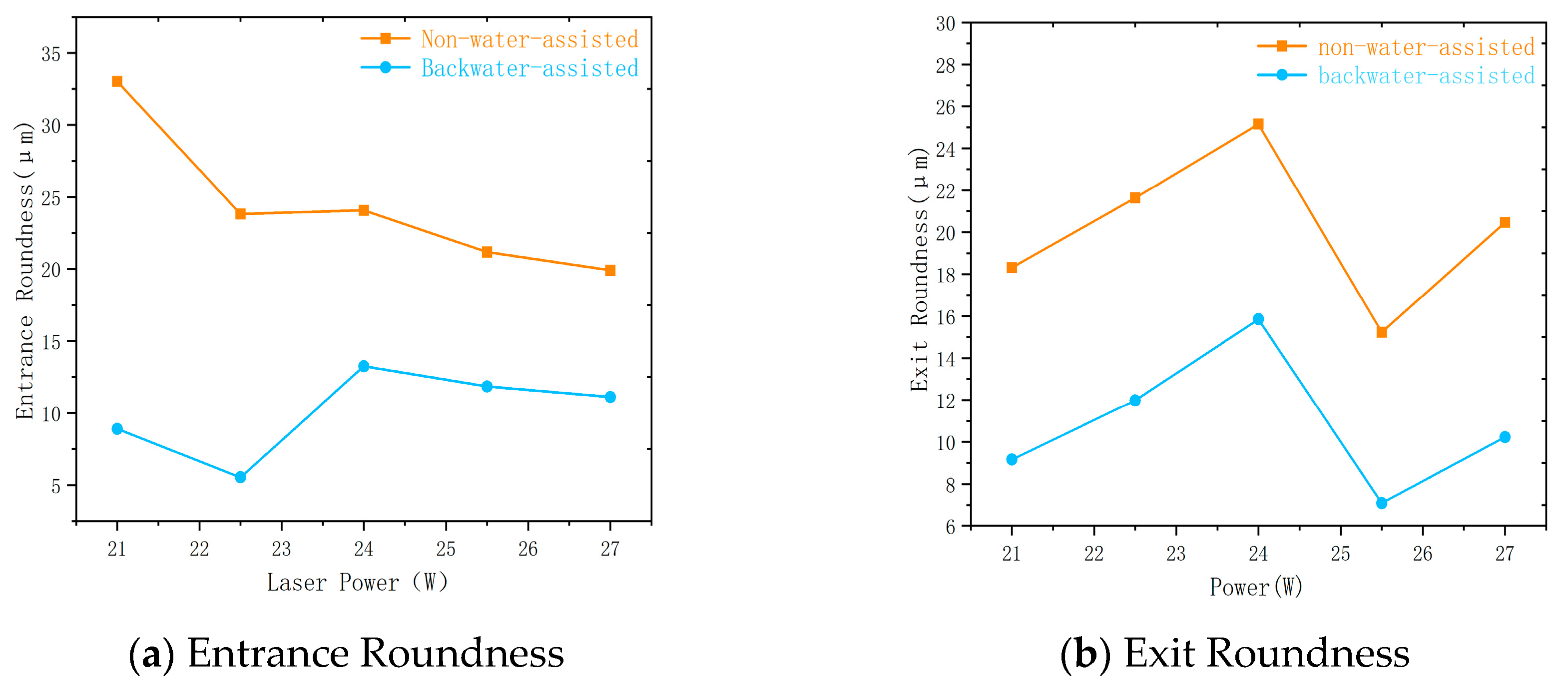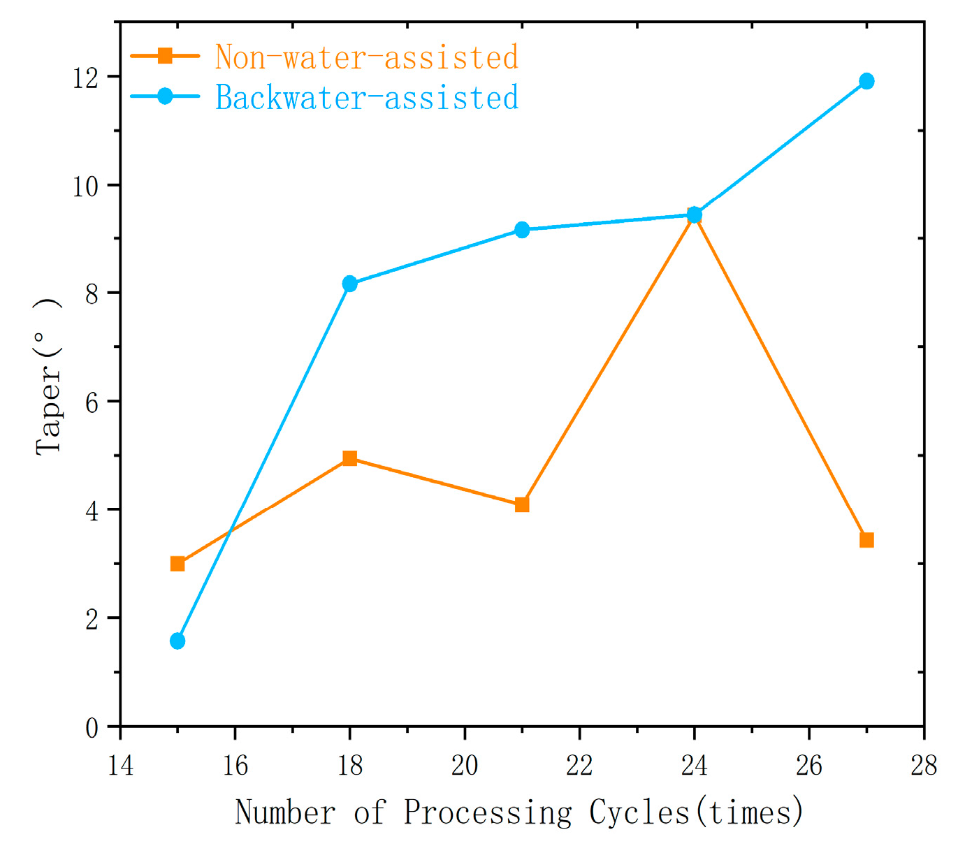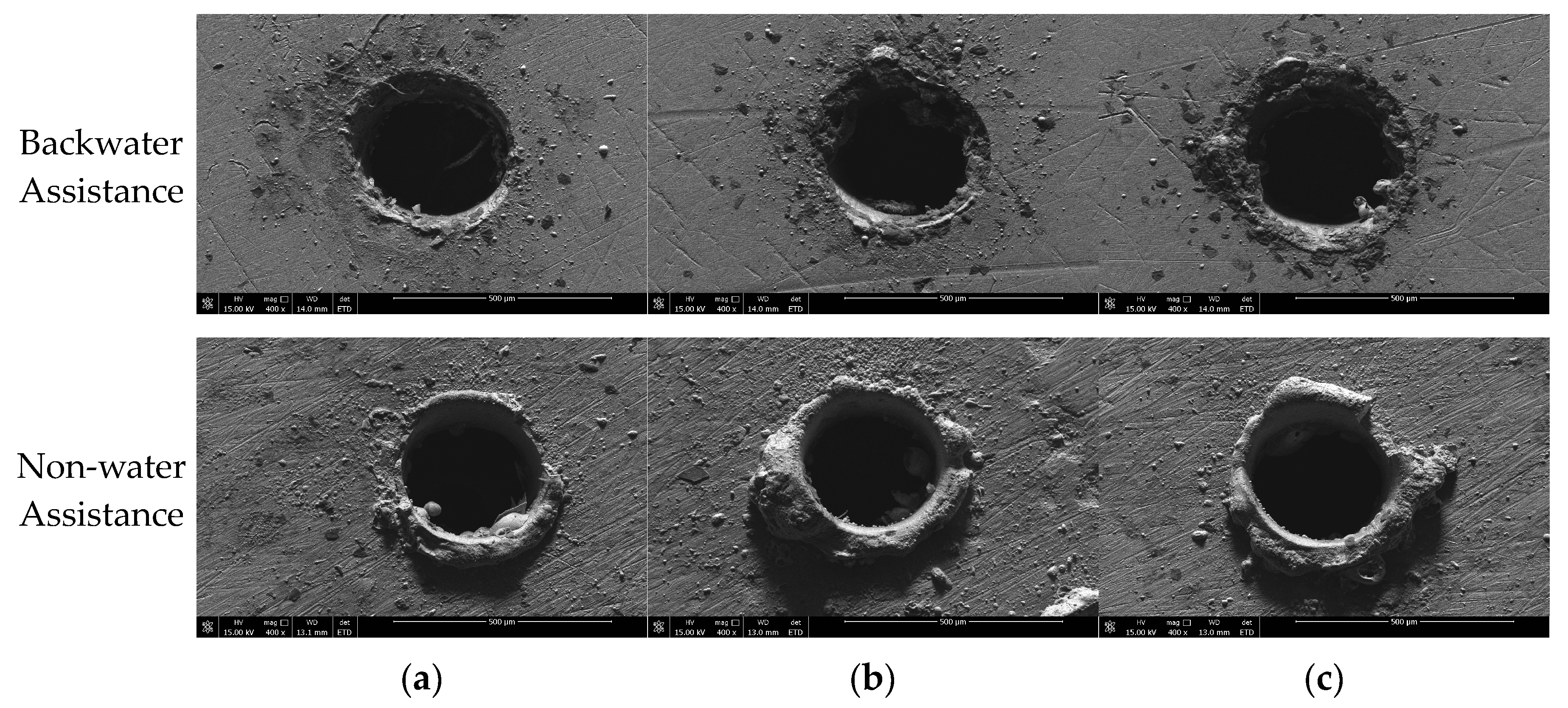 - Backwater assistance outperforms the non-water environment in terms of hole roundness and hole wall surface quality. However, the taper angle shows greater deviation compared to the non-water condition.