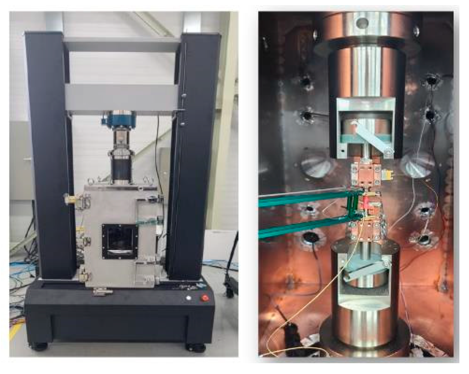 To evaluate the cryogenic mechanical properties of the materials, tensile tests were conducted on 9% Ni steel and STS 316L stainless steel base metals according to the ASTM E8/E8M-23 standard test method [11]. Ultra-low-temperature tensile testing was performed using a cryostat-integrated universal testing machine (Cryo H&I, Pyeongtaek-si, Republic of Korea) specifically designed for subzero applications. Figure 1 shows the cryogenic tensile testing system employed in this study, capable of reaching temperatures as low as −260 °C. The cooling chamber was equipped with three 4 K-capacity cryo-coolers to minimize thermal disturbances during testing. It requires approximately 90 min to reach −253 °C prior to test initiation.