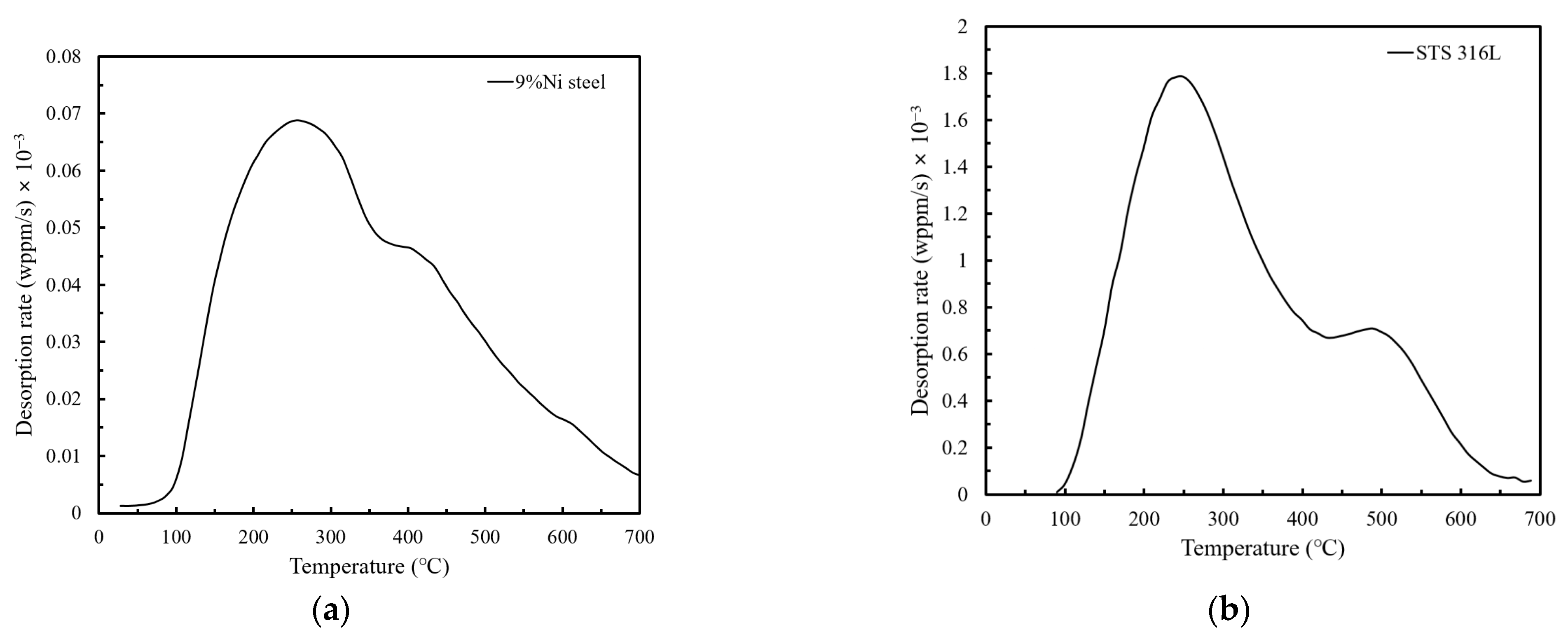 In this study, the amount of hydrogen absorbed into the material was quantitatively analyzed using TDS to measure the amount of hydrogen absorbed into the test piece immediately after hydrogen charging [26]. TDS is a technique that measures the quantity of gas desorbed from a specimen as it is gradually heated, typically over a temperature range of 25 °C to 700 °C. Desorbed hydrogen was detected using a mass spectrometer or thermal conductivity detector, and the total amount of hydrogen was determined by integrating the signals over time. The results are expressed as the weight fraction of hydrogen relative to the specimen mass (wppm). Using the TDS method, the hydrogen concentrations in the CTOD specimens subjected to the electrochemical hydrogen charging procedure were 0.422 weight parts per million (wppm) for the 9% Ni steel and 0.840 wppm for the STS 316L steel. The results of the hydrogen uptake analysis for both steels, conducted using TDS, are presented in Figure 5. In materials with the BCC crystal structure, hydrogen diffusion is relatively rapid owing to the shorter diffusion paths and easier interstitial migration. This promotes localized stress concentration, which can significantly enhance susceptibility to HE [27]. Previous studies have shown that in BCC materials, ductility and fracture toughness can be significantly degraded at hydrogen concentrations as low as approximately 0.5 wppm, a level sufficient to initiate brittle fracture mechanisms [18]. Therefore, the hydrogen content introduced in this study was considered sufficient for investigating the embrittlement behavior and its influence on the fracture toughness of BCC-structured cryogenic steels. The diffusion behavior of hydrogen in metallic materials is strongly influenced by their crystallographic structures. In contrast, materials with FCC structures, such as austenitic stainless steels (e.g., STS 316L), exhibit significantly lower hydrogen diffusivity. The FCC lattice was more densely packed with smaller interstitial spaces, which hindered the movement of hydrogen atoms. Consequently, hydrogen penetration in FCC materials tends to be shallow and slow, often limited to the surface or near-surface regions, even after extended charging durations. Although this low diffusivity provides higher resistance to HE, hydrogen can become trapped once absorbed, and localized embrittlement may still occur under specific conditions. This fundamental difference in hydrogen diffusion rates between the BCC and FCC structures is a key factor in material selection for hydrogen-related environments and in designing effective hydrogen charging and embrittlement resistance testing protocols.