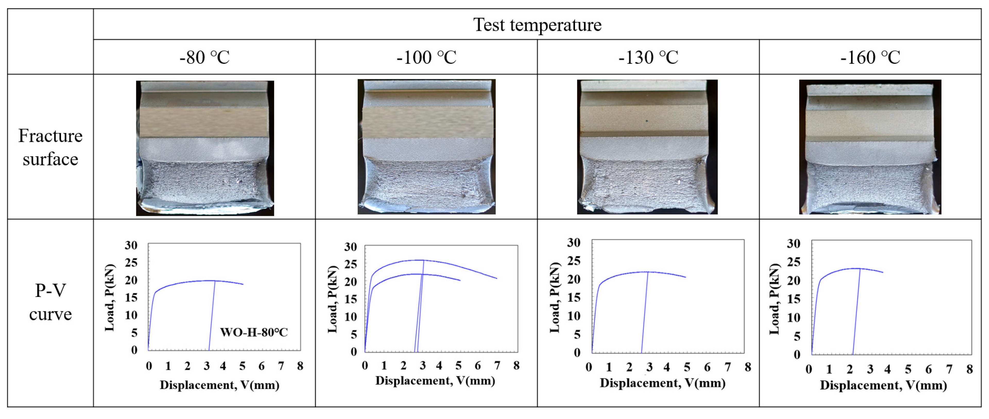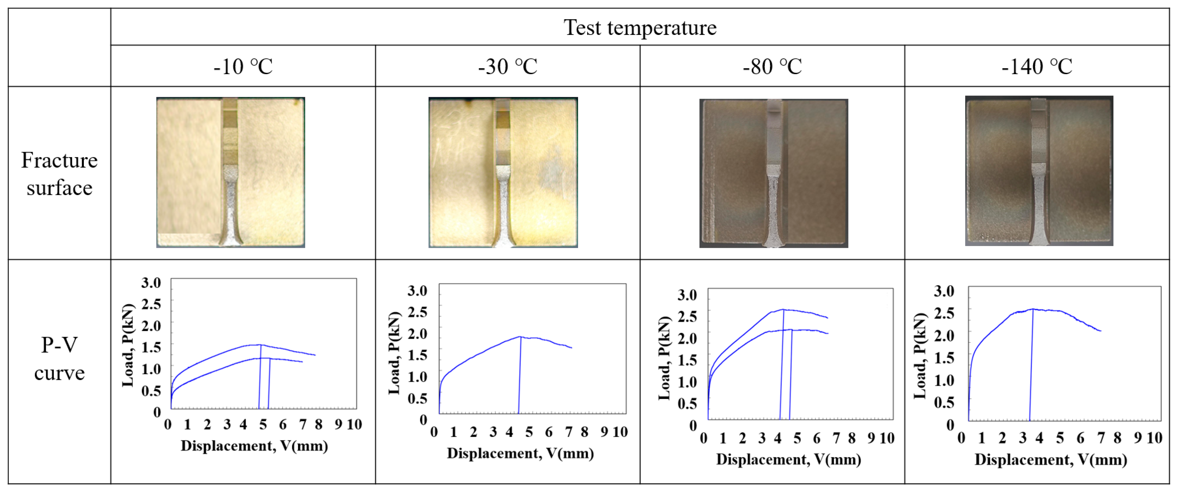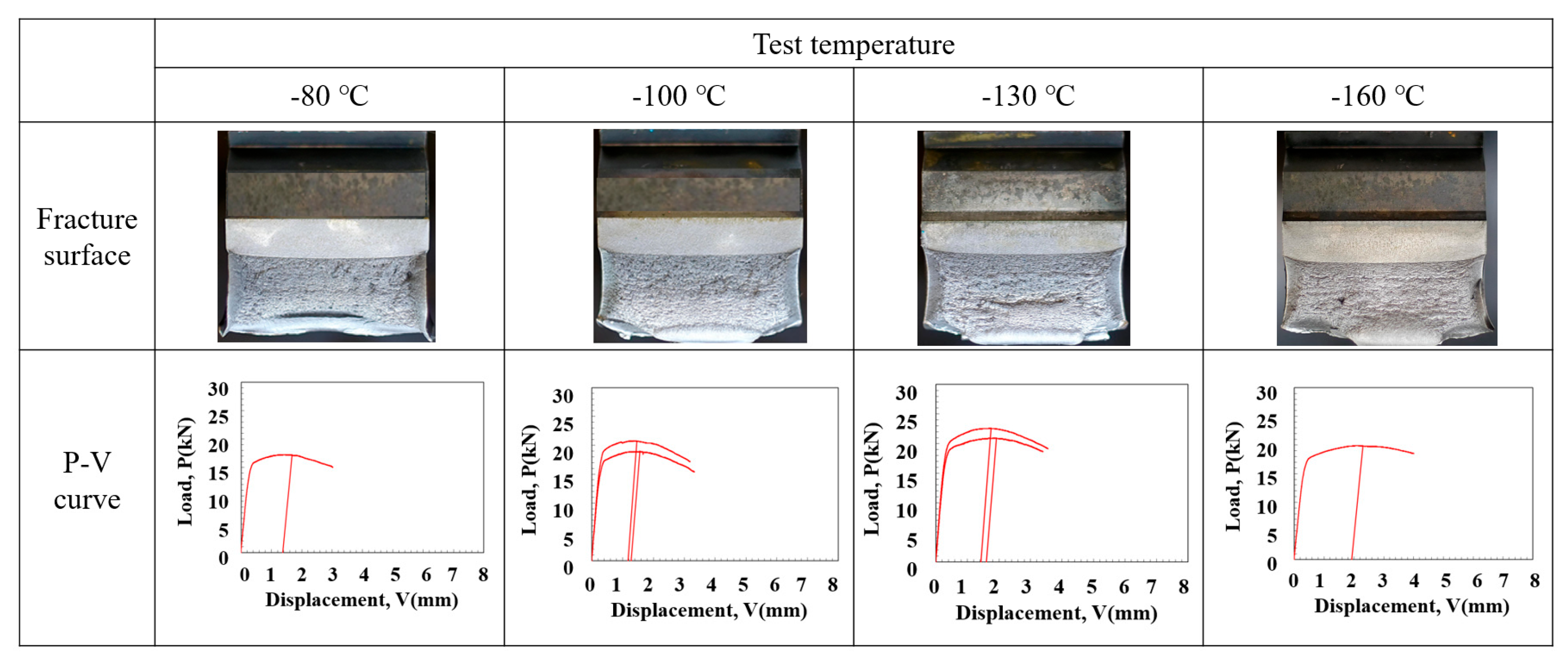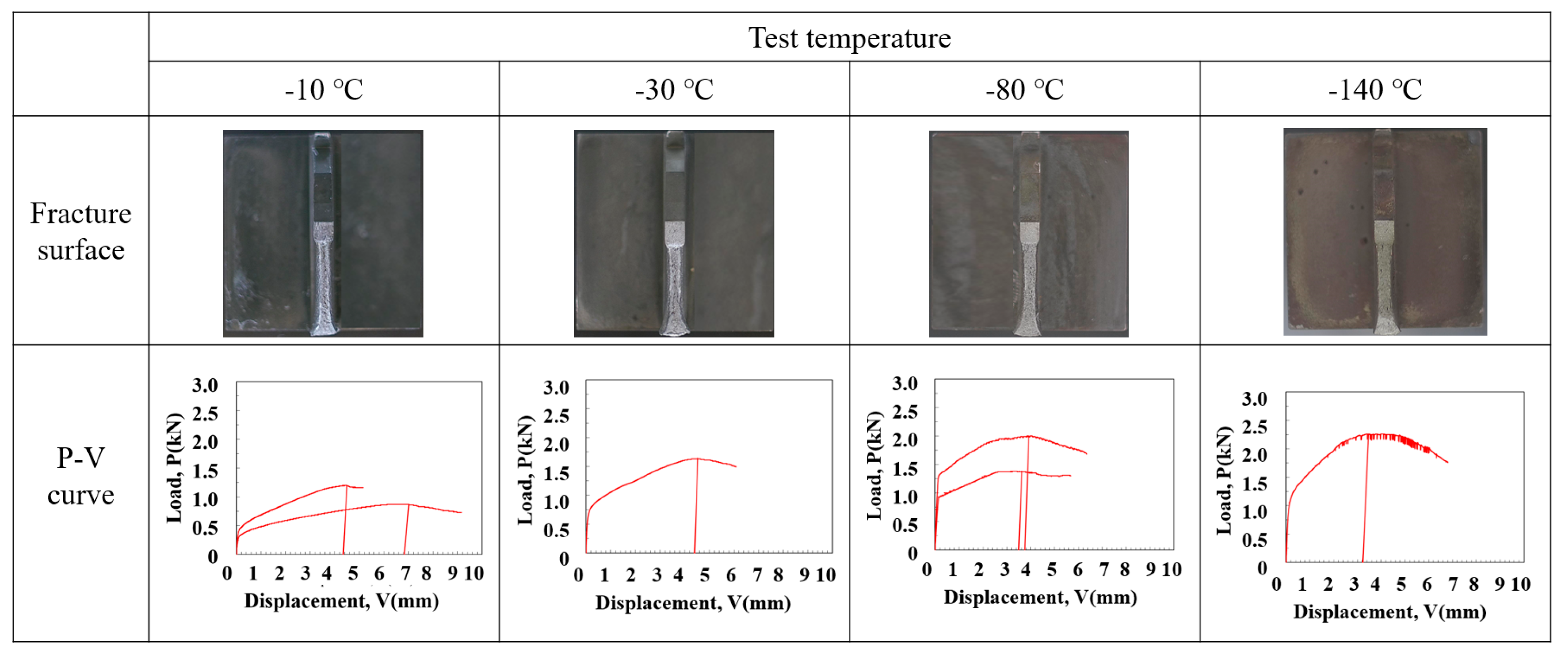 Figure 8 shows the load–displacement (P–V) curves and fracture surfaces of each hydrogen-charged 9% Ni specimen. At −80 °C, predominantly ductile fracture features were observed, although some regions showed hydrogen-induced brittle morphology. The P–V curve displayed a typical post-peak softening behavior. At −100 °C and −130 °C, although differences in maximum load were observed, the CTOD values were relatively consistent, and fracture surfaces showed mixed features, indicating the combined effects of temperature and hydrogen. At −160 °C, the fracture surfaces were mostly ductile with partial brittle areas, and the P–V curves showed softening after peak load, similar to the hydrogen-free condition. This suggests that at −160 °C, the influence of temperature degradation was dominant, whereas the hydrogen effect was significantly diminished.
