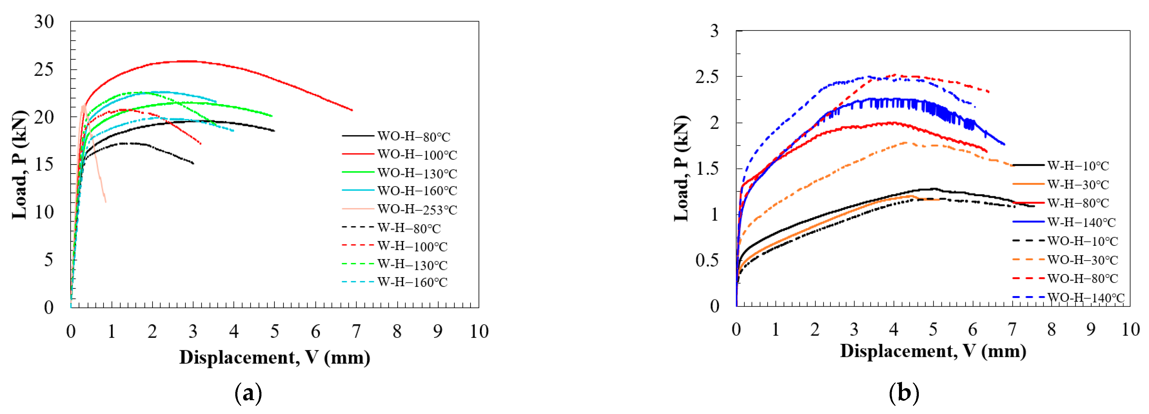 Hydrogen charging resulted in a reduction in both load and displacement. In certain cases, the localized stress concentration due to hydrogen led to slightly increased loads, although the general trend indicated reduced mechanical performance. These findings are consistent with those of conventional tensile testing, in which hydrogen charging has been shown to reduce the ductility. In 9% Ni steel, at −160 °C, the W-H specimen unexpectedly exhibited a higher load than the WO-H specimen, which is attributed to differences in the initial crack size (a0/W), rather than an intrinsic improvement in fracture resistance. At such ultralow temperatures, hydrogen mobility is significantly suppressed, and the fracture behavior is predominantly governed by the temperature effect alone.