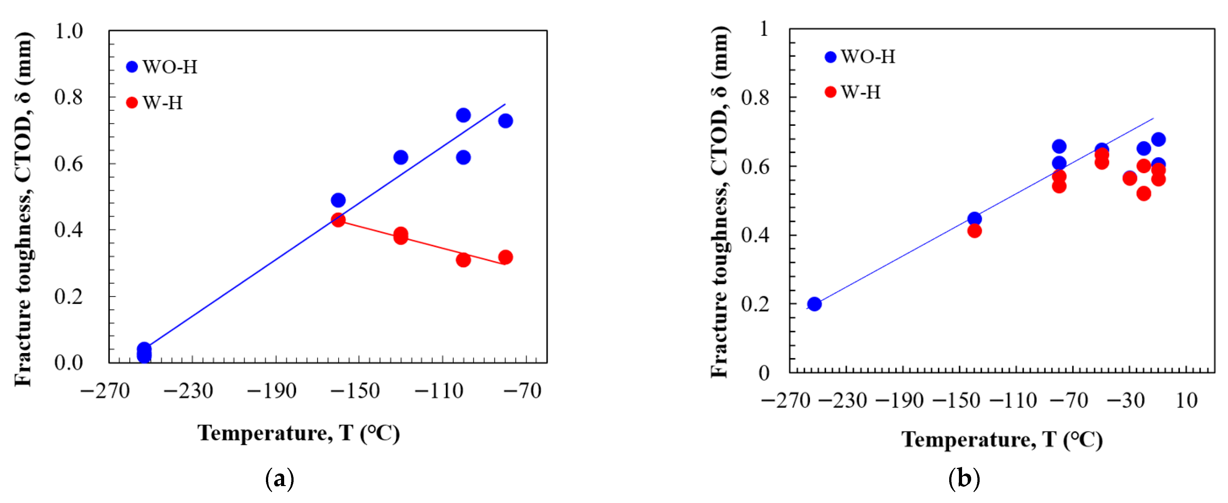 Figure 11. CTOD values for WO-H and W-H conditions at cryogenic temperatures: (a) 9% Ni steel; (b) STS 316L steel.
