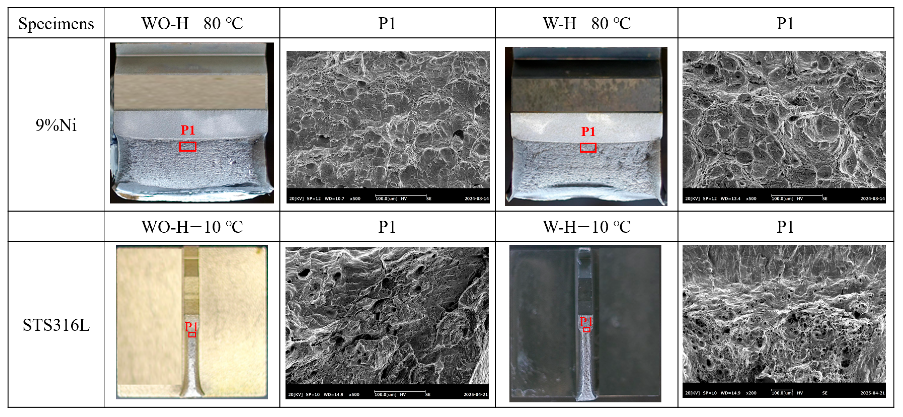 Figure 12. SEM fracture surface analysis of WO-H and W-H specimens tested at −80 °C and −10 °C with 9% Ni and STS316L specimens.