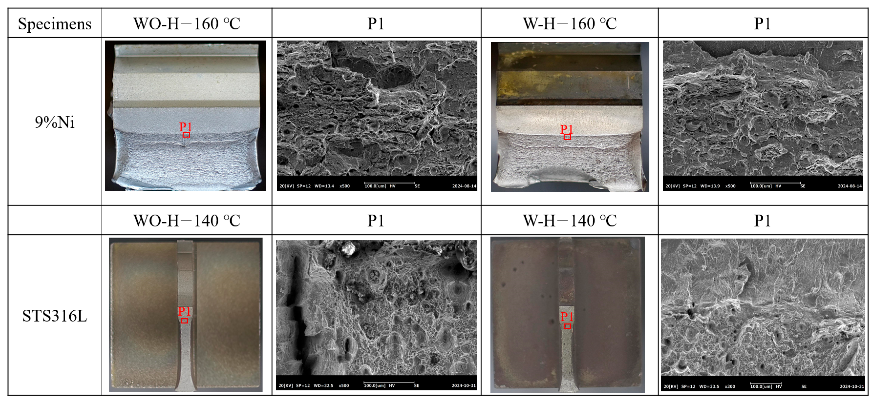 Figure 13. SEM fracture surface analysis of WO-H and W-H specimens tested at −160 °C and −140 °C with 9% Ni and STS316L specimens.