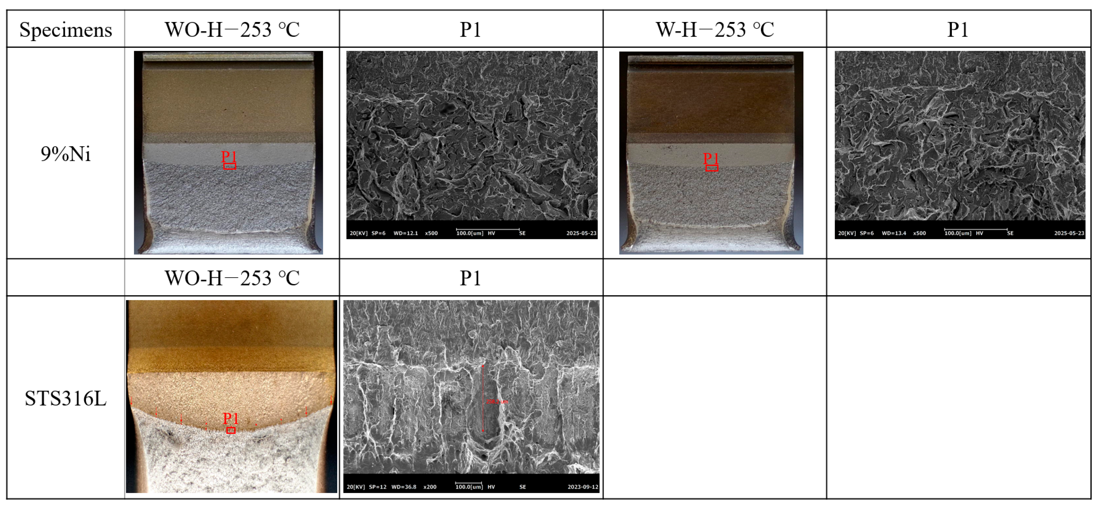 Fracture morphology and SEM observations: SEM analysis corroborated the mechanical findings, showing predominantly ductile features at higher temperatures and increasing brittleness with decreasing temperature. The 9% Ni steel without hydrogen charging exhibited brittle morphology over nearly the entire fracture surface. In contrast, STS316L without hydrogen charging displayed limited brittle features localized at the notch tip, while the overall fracture surface remained ductile.