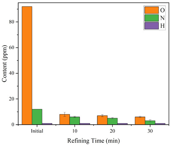 Figure 1 presents the variations in gas impurities of the remelted ingots refined for 10, 20, and 30 min at a fixed refining temperature of 1650 °C, and Table 2 lists the major chemical composition of the purified ingots. At 1650 °C, extending the refining time from 10 min to 30 min resulted in a gradual decrease in the O content, from 8 ppm at 10 min to 6 ppm at 30 min. The N content also decreased steadily, from 6 ppm at 10 min to 5 ppm at 20 min, and further to 3 ppm at 30 min. H remained consistently below the detection limit (<1 ppm) throughout all refining durations. These results indicate that a 10 min refining duration is sufficient to achieve effective removal of both O and H, while further extending the time contributes to only marginal improvement in O removal but provides a more noticeable benefit for N reduction.