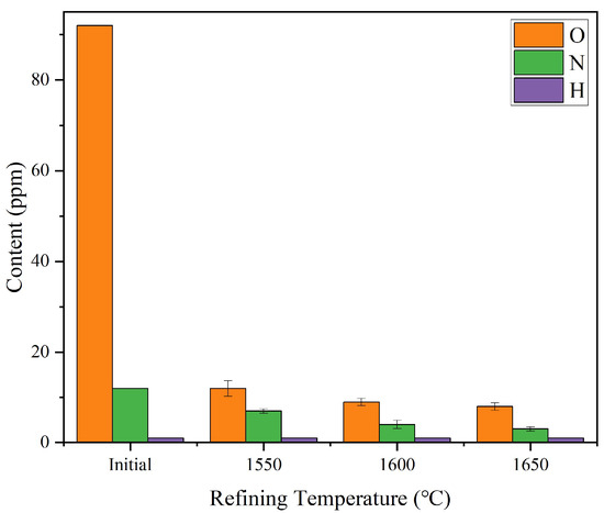 Figure 2 shows the results of gas impurities when refining at 1550 °C, 1600 °C, and 1650 °C with a fixed refining time of 10 min, and Table 3 shows the major chemical composition of purified ingot. As the refining temperature increased from 1550 °C to 1650 °C, a significant downward trend was observed in the O and N contents of the remelted ingots, while the H content consistently remained below the detection limit (<1 ppm). Specifically, when the temperature was raised from 1550 °C to 1600 °C, the O content decreased from 12 ppm to 9 ppm and the N content from 7 ppm to 4 ppm. Further increasing the temperature to 1650 °C resulted in a slight reduction to 8 ppm and 3 ppm for O and N, respectively. These results indicate that refining temperatures above 1600 °C substantially enhance the removal efficiency of dissolved gases. This improvement is attributed to the elevated temperature reducing melted viscosity and interfacial tension, thereby promoting the transfer of dissolved gas molecules into bubbles and their subsequent floatation and removal. However, the marginal benefit of gas removal from 1600 °C to 1650 °C becomes limited, suggesting diminishing returns at higher temperatures. Therefore, 1600 °C can be considered an optimal refining temperature that balances effective gas purification with energy efficiency.