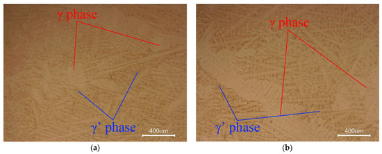 Optical microscopy (Figure 3) shows that both the as-received and refined samples exhibit a typical γ/γ′ dual-phase microstructure. Dendritic features are present in both conditions, with no obvious differences in grain size or secondary dendrite arm spacing. The γ′ precipitates are uniformly distributed, and no harmful phases or abnormal grain growth were detected.