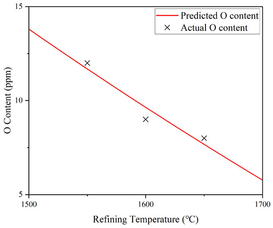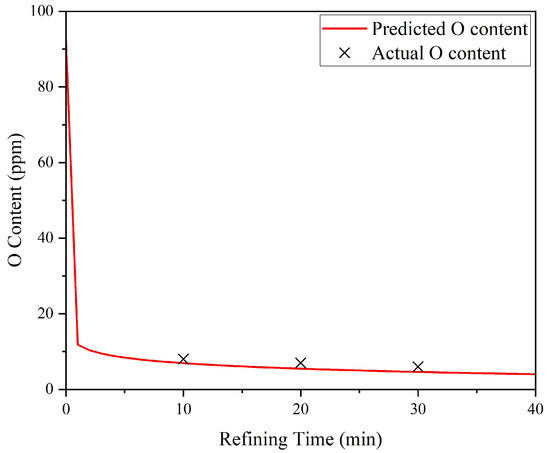 The proposed model was validated using multiple experimental data points and demonstrated good consistency with the observed deoxidation behavior. As shown in Figure 6 and Figure 7, the simulated prediction curves closely match the measured O contents for two representative conditions: refining at 1650 °C for varying durations and refining at a fixed duration of 10 min across a temperature range of 1500–1700 °C, both at an initial O content of 92 ppm. The alignment between simulated prediction and experiment further confirms the model’s reliability.