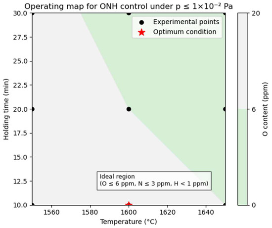 Operating map showing the acceptable refining window (shaded region) satisfying ONH specifications (O ≤ 6 ppm, N ≤ 3 ppm, H < 1 ppm) as a function of temperature and holding time under p ≤ 1 × 10−2 Pa (5 × 10−3–1 × 10−2 Pa).