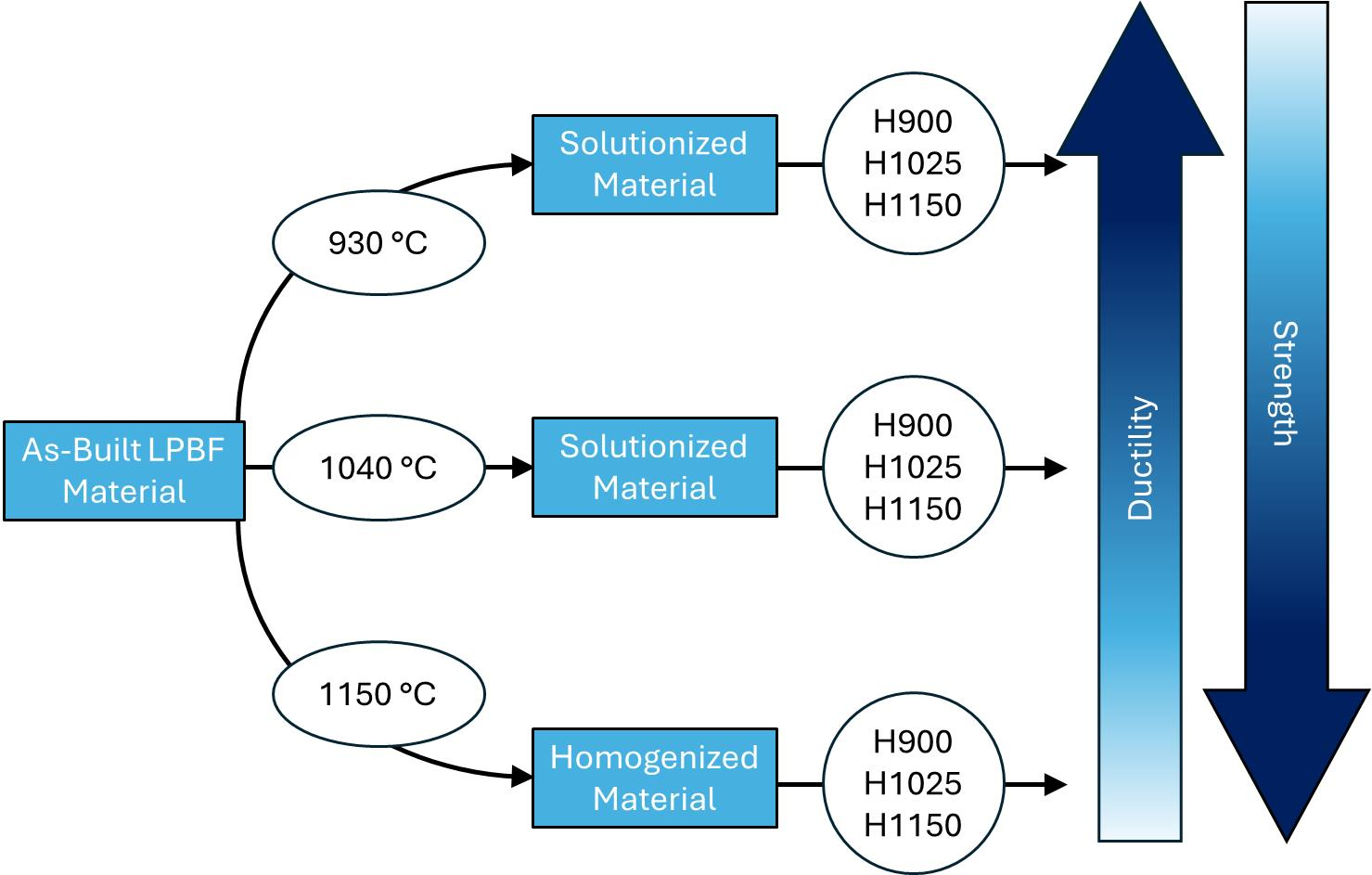 - A Condition A-like (solution-annealed) microstructure is achievable by using either a 1040 °C or 1150 °C treatment on the as-built LPBF microstructure.