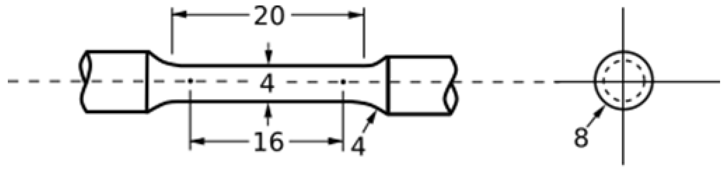 - E8/E8M-22; Standard Test Methods for Tension Testing of Metallic Materials. ASTM International: West Conshohocken, PA, USA, 2022. [CrossRef]