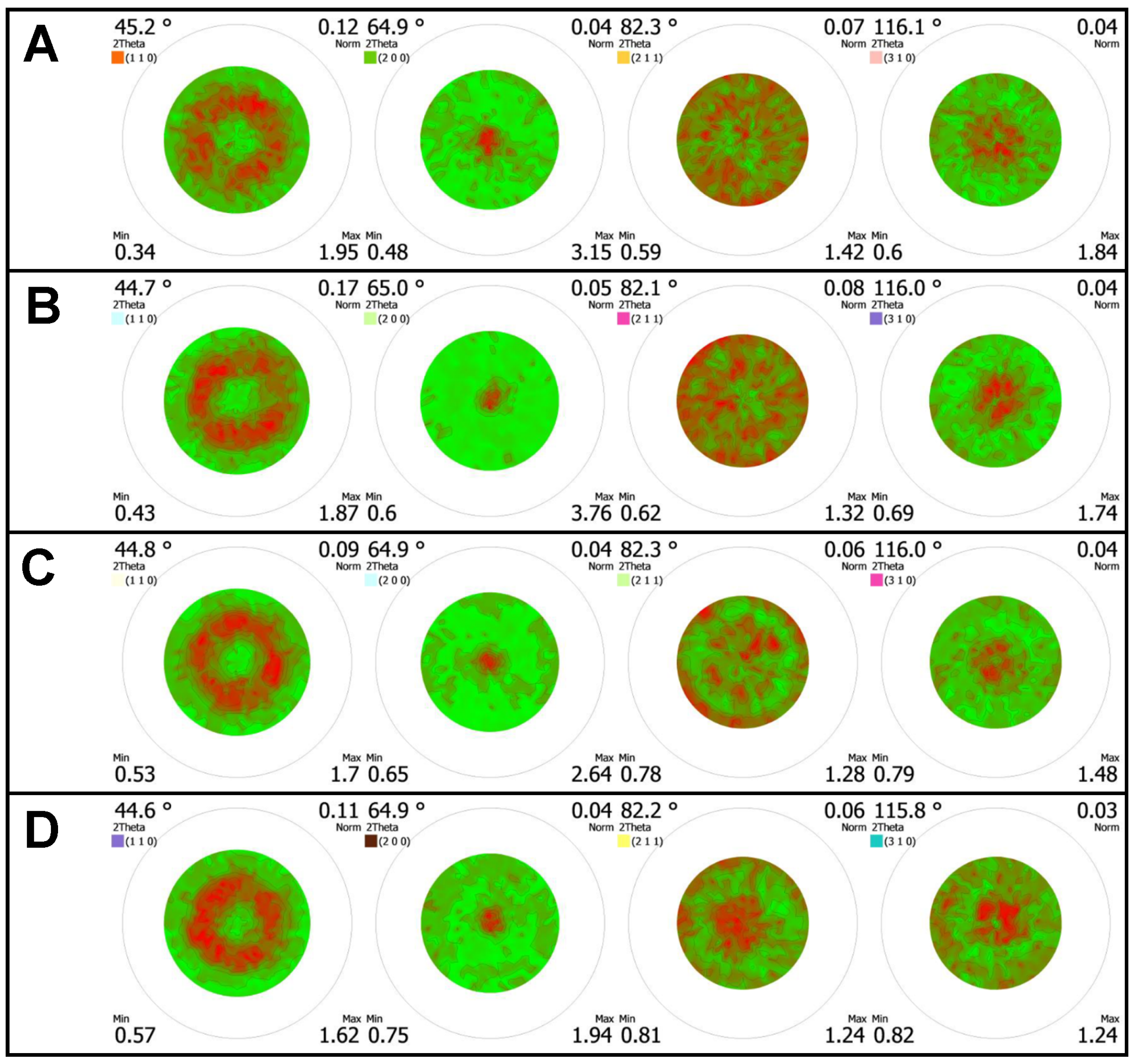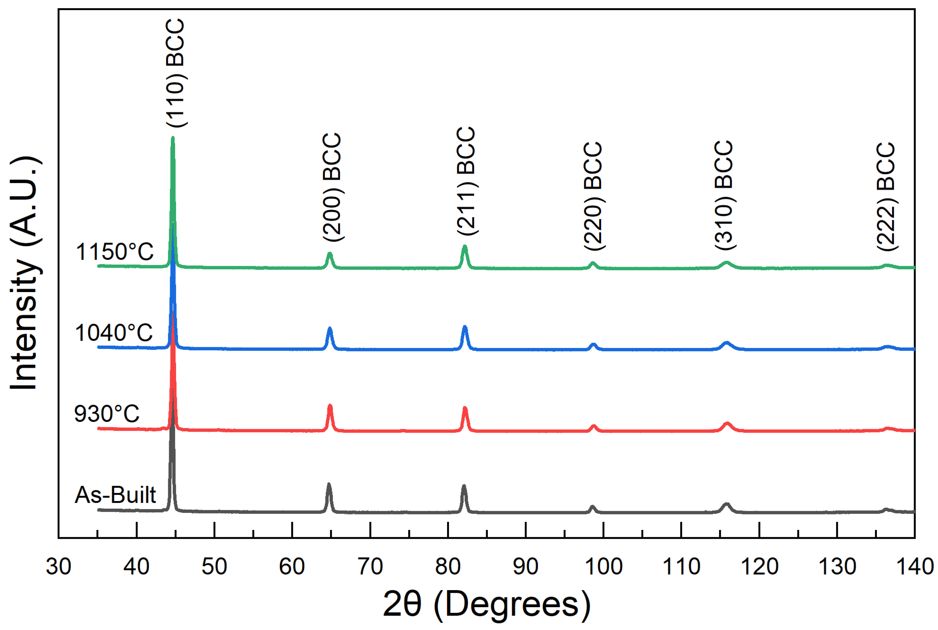 - Material treated at 930 °C exhibits a unique primary BCC microstructure with small amounts of retained austenite on the order of what was measured in the as-built material without typical martensitic features. This treatment results in a lowered overall strength, but demonstrates improved ductility.