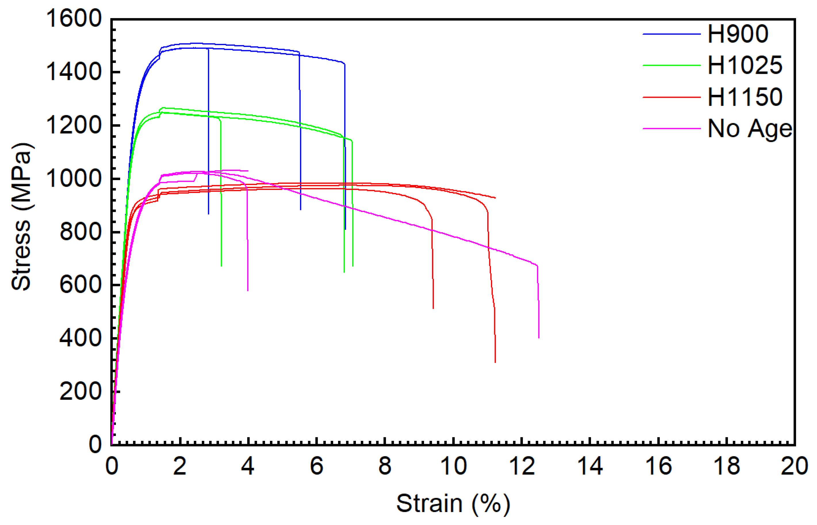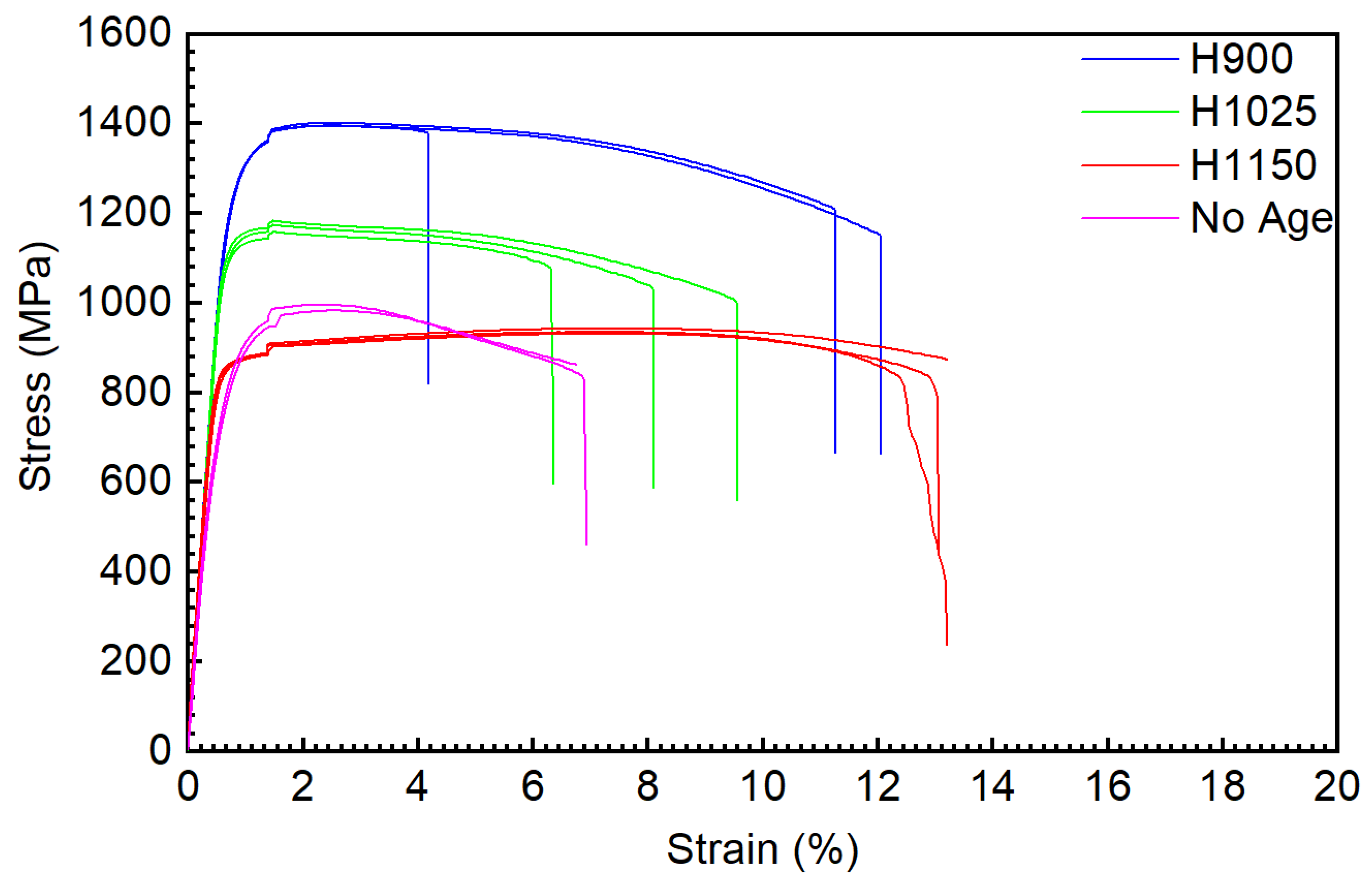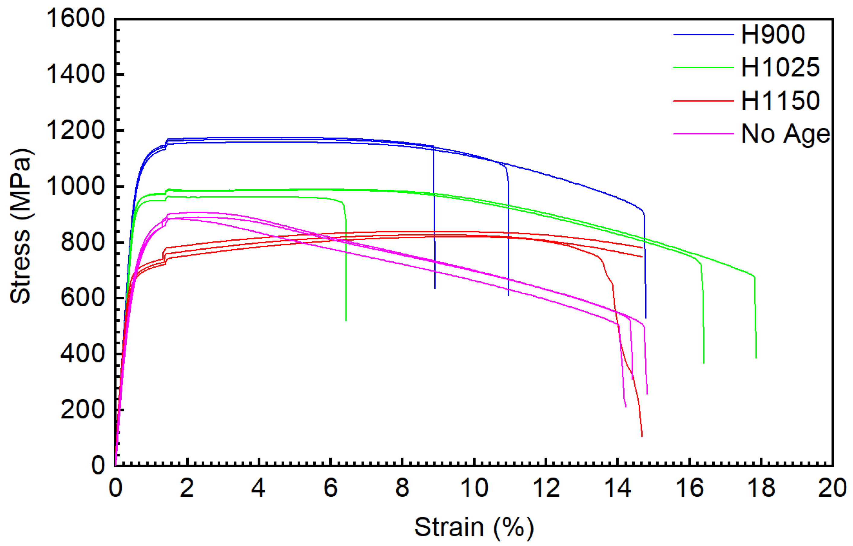 - For all evaluated starting conditions resulting from a 930 °C, 1040 °C, and 1150 °C treatment, the typical progression seen in wrought material for aging per ASTM A564 was demonstrated. Peak aging occurred at the H900 treatment with the highest strength, and the over-age treatments of H1025 and H1150 demonstrated reduced strength and increased ductility.