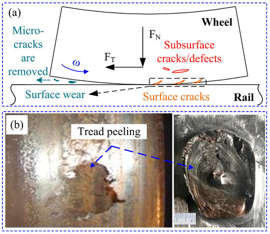 (a) Schematic diagram of tread peeling on wheel tread caused by RCF loads. (b) Typical surface morphology of tread peeling [3]. (Reprinted with permission from ref. [3]. 2025, ELSEVIER).