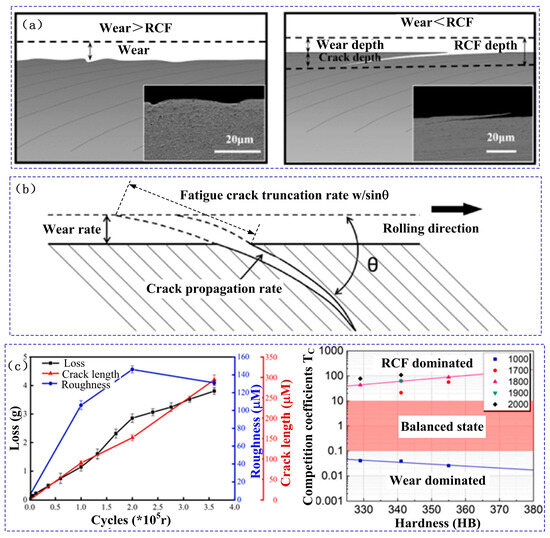 (a) The coupling and competitive relationship between wear and fatigue in the process of tread peeling and (b) competitive between wear and fatigue. (c) Wear rate and crack growth rate at different cycles [23,24,26]. (Reprinted with permission from ref. [23,24,26]. 2025, ELSEVIER).