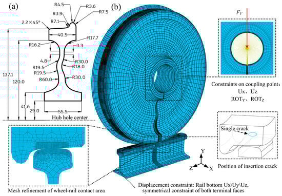 FE model of wheel and rail for single crack: (a) schematic diagram with wheel dimensions; (b) mesh of model, boundary conditions, and initial-crack location.