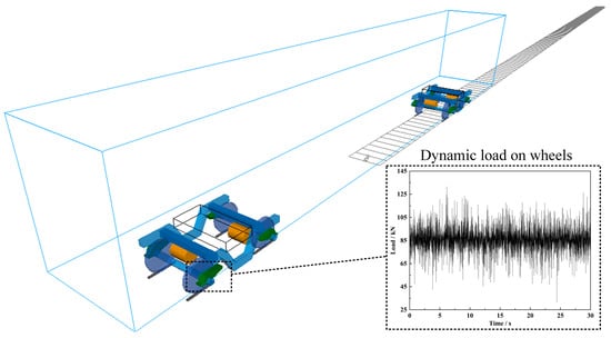 During the normal service process of a train, the load on the wheel is not constant but fluctuates. Therefore, in this paper, the software program SIMPACK 2019x was utilized to perform dynamic simulation according to the typical service parameters of the Chinese high-speed EMU train. The dynamic load on the wheel during vehicle operation was extracted, and the vehicle dynamics simulation model is shown in Figure 5.