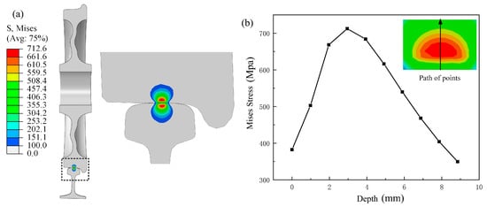 (a) The von Mises stress contour of the cross-section of the wheel–rail contact area; (b) the distribution of von Mises stress in the wheel along the depth direction starting from the wheel–rail contact point.