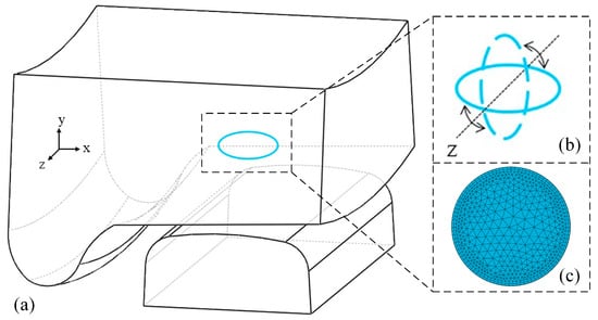 To obtain the most dangerous initial-crack angle beneath the wheel tread and the most critical fatigue crack propagation path, a circular initial crack with a radius of 1 mm was inserted at a depth of 3 mm below the wheel tread, as shown in Figure 7a. Taking the crack parallel to the horizontal plane (X0Z) as the reference, it was rotated around the Z-axis, as shown in Figure 7b. The clockwise rotation angle around the Z-axis is defined as positive and the counterclockwise rotation angle as negative. For example, “Z45” represents the crack after a 45° clockwise rotation along the Z-axis relative to the reference crack. Initial cracks at different angles were inserted, and their fatigue crack propagation behaviors were calculated to determine the situation where the crack propagates the fastest, which is also the most dangerous condition for the wheel with an initial fatigue crack, laying the foundation for subsequent research. The mesh of the initial crack is shown in Figure 7c.