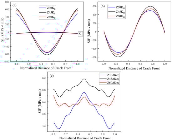 Crack rotated clockwise along the Z-axis. (a) The distribution of KI and KII at the crack tip, (b) the distribution of KIII at the crack tip, and (c) the distribution of ΔKeq at the crack tip.