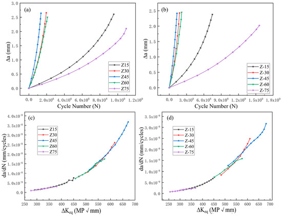 Curves of crack propagation cycles versus propagation length: (a) crack rotated clockwise around the Z-axis; (b) crack rotated counterclockwise around the Z-axis. Curves of crack propagation rate versus equivalent stress intensity factor: (c) crack rotated clockwise around the Z-axis; (d) crack rotated counterclockwise around the Z-axis.