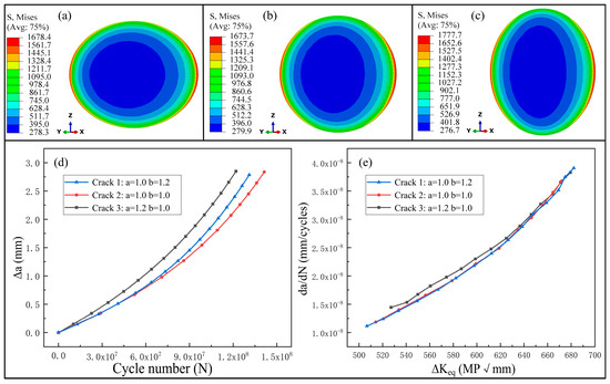 The von Mises stress contour of initial elliptical cracks: (a) Crack 1: a = 1, b = 1.2; (b) Crack 2: a = 1, b = 1; (c) Crack 3: a = 1.2, b = 1. The propagation behavior of elliptical cracks: (d) the curves of the number of the crack propagation cycles versus the propagation amount and (e) the curves of the crack propagation rate versus the equivalent ΔKeq.