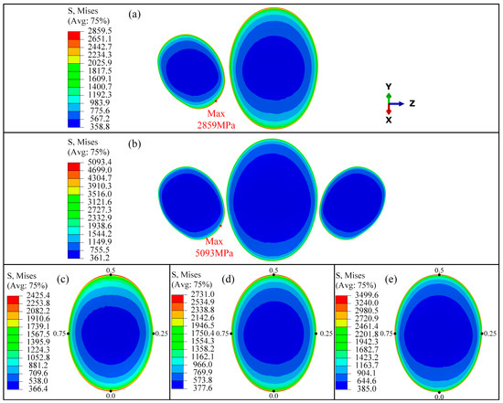 Under actual service conditions, most cracks in wheels are elliptical. Therefore, this section investigates the influence of different elliptical aspect ratios on fatigue crack propagation. The diameter of the ellipse along the Z-axis direction is defined as “a”, and the diameter in the other direction is defined as “b”. At a depth of 3 mm below the wheel tread, cracks with different morphologies are inserted into the most dangerous case mentioned above. Figure 11a–c show the von Mises stress contour of the initial elliptical cracks. It can be seen from the figures that the maximum von Mises stress of the three cracks is located on the right side of the cracks. The stress of the circular crack is lower than that of the elliptical cracks, and the elliptical crack with a = 1.2 and b = 1 exhibits the highest stress. This indicates that the elliptical crack does not alter the initial propagation direction of the crack (i.e., the position with the maximum von Mises stress), but it increases the initial von Mises stress of the crack, making the crack more susceptible to fatigue propagation.