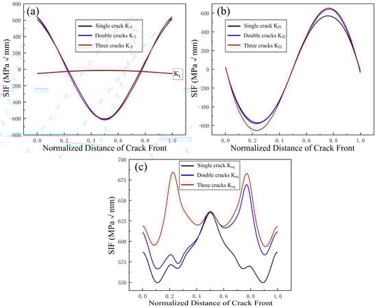 The distributions of the SIFs of the main cracks in the three models are shown in Figure 14a,b. It can be seen from the figures that the KI and KII of the cracks in each model are basically consistent, but KIII shows obvious differences. At the crack front of 0.25, the SIF of the triple-crack model is greater than those of the other two models, because the main crack is close to one of the secondary cracks at this position. Similarly, at the crack front of 0.75, both the double-crack and triple-crack models have secondary cracks, so their SIFs are relatively large. As shown in Figure 14c, the equivalent SIF at the crack front of 0.5 (i.e., the position with the fastest propagation in the single-crack model) is basically the same for each model, and the equivalent SIFs are larger in the directions of the secondary cracks in their respective models (double-crack model: 0.75; triple-crack model: 0.25, 0.75).
