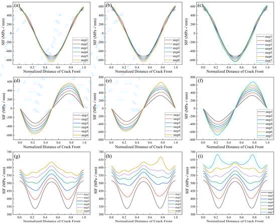 Curves of KII for the main crack varying with crack propagation: (a) single-crack model, (b) double-crack model, and (c) triple-crack model. Curves of KIII for the main crack varying with crack propagation: (d) single-crack model, (e) double-crack model, and (f) triple-crack model. Curves of crack equivalent SIF for the main crack varying with crack propagation: (g) single-crack model, (h) double-crack model, and (i) triple-crack model.
