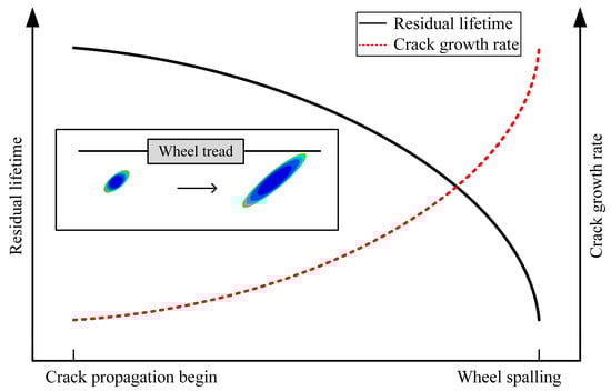 Based on the aforementioned research results, the subsurface fatigue cracks in the wheel lie in a slow-propagation region in the early stage of propagation, featuring a relatively low crack growth rate. However, as the crack propagation length increases and enters the rapid-propagation zone, the crack growth rate gradually accelerates, and the reduction rate of the wheel’s remaining peeling life speeds up, as shown in Figure 18. It is specified that when the crack propagates to the wheel tread, severe peeling occurs in the wheel. Therefore, subsurface fatigue cracks in the wheel should be detected, and maintenance should be carried out as early as possible to prevent cracks from entering the rapid-propagation zone and causing wheel failure.