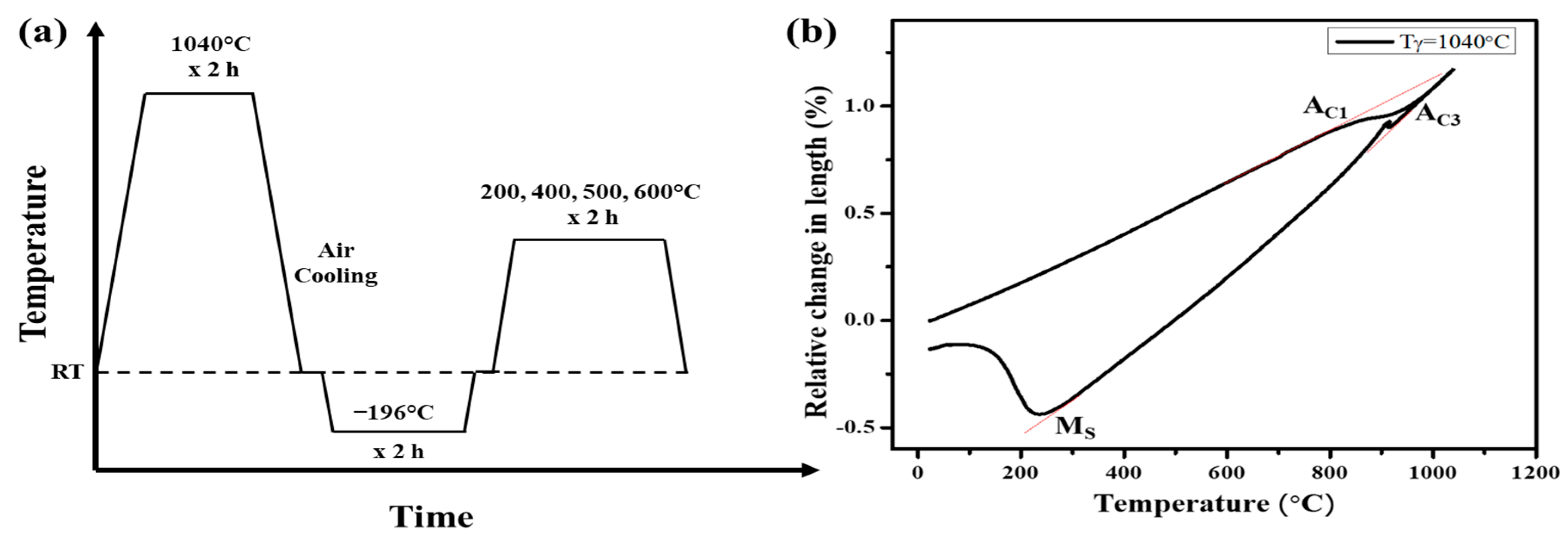 - Yan, J.; Zhang, C.; Guo, J.; Dong, G.; Wang, S.; Gao, J.; Wu, H.; Zhao, H.; Lu, J.; Huang, Y.; et al. Investigating the influence mechanisms of cryogenic treatment on mechanical properties and wear resistance of AISI 4340 steel. J. Mater. Res. Technol. 2025, 38, 3264–3276. [Google Scholar] [CrossRef]