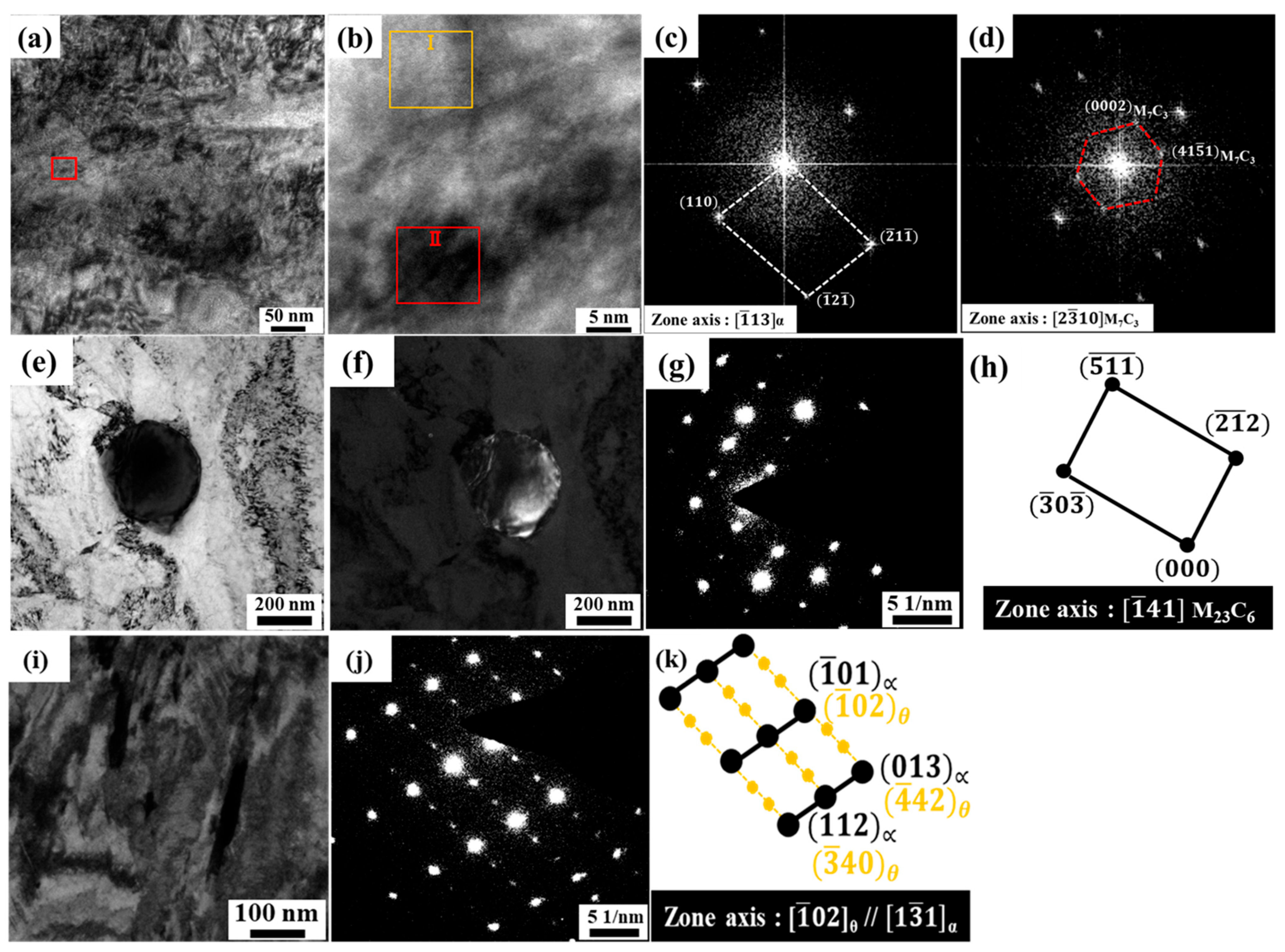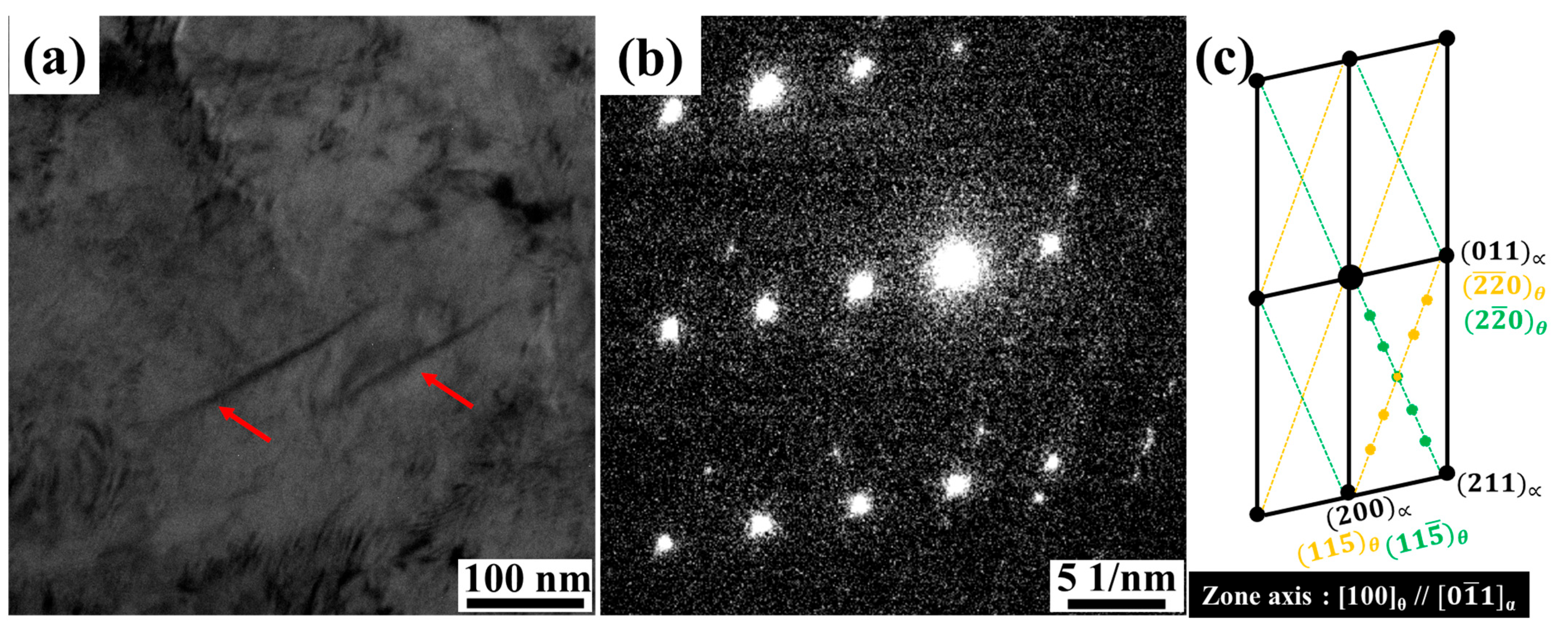 - Liu, T.; Li, T.; Liu, X. TEM and electron diffraction analysis of ω-Fe to cementite transformation in quenched and tempered high carbon steels. AIP Adv. 2019, 9, 045219. [Google Scholar] [CrossRef]