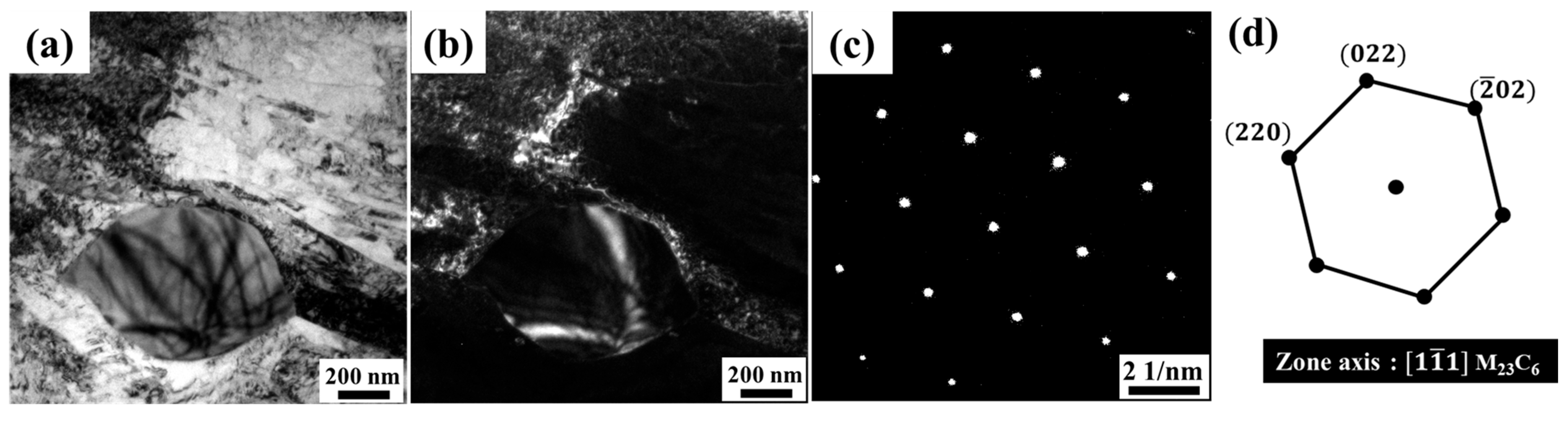 - Kaneko, K.; Fujita, K.; Sadakata, A.; Tomokiyo, Y.; Matsumura, S. Nanostructural and nanoelemental analysis of metastable M3C-type carbides with alloy-rich layer in heat resistant 2Cr-martensitic steel. Scr. Mater. 2003, 48, 761–765. [Google Scholar] [CrossRef]